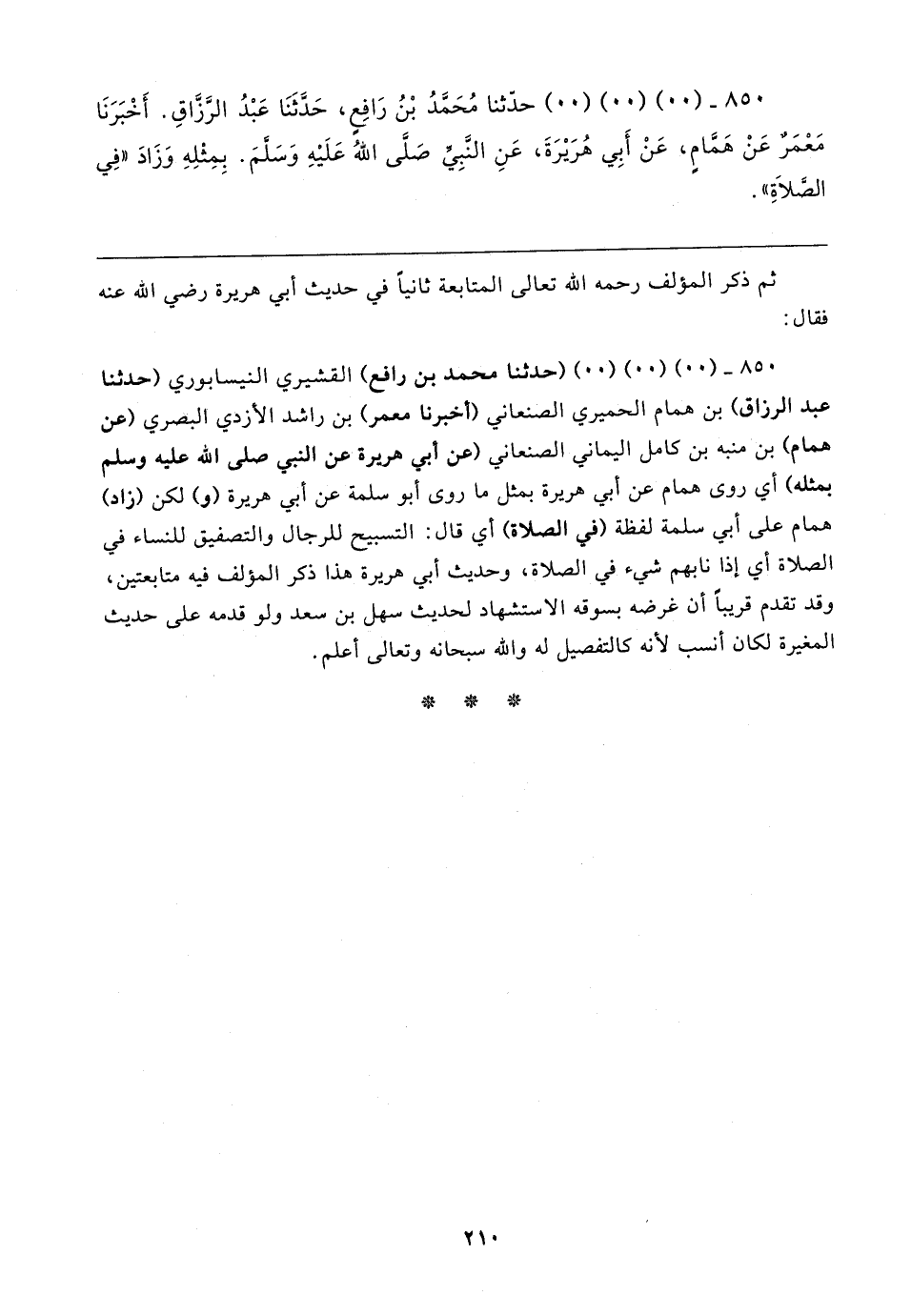 ٨٥٠ - (٠٠) (٠٠) (٠٠) (حَدَّثَنَا محمد بن رافع) القشيري النيسابوري (حَدَّثَنَا عبد الرزاق) بن همام الحميري الصنعاني (أخبرنا معمر) بن راشد الأزدي البصري (عن همام) بن منبه بن كامل اليماني الصنعاني (عن أبي هريرة عن النبي صلى الله عليه وسلم بمثله) أي روى همام عن أبي هريرة بمثل ما روى أبو سلمة عن أبي هريرة (و) لكن (زاد) همام على أبي سلمة لفظة (في الصلاة) أي قال: التسبيح للرجال والتصفيق للنساء في الصلاة أي إذا نابهم شيء في الصلاة، وحديث أبي هريرة هذا ذكر المؤلف فيه متابعتين، وقد تقدم قريبًا أن غرضه بسوقه الاستشهاد لحديث سهل بن سعد ولو قدمه على حديث المغيرة لكان أنسب لأنه كالتفصيل له والله سبحانه وتعالى أعلم.