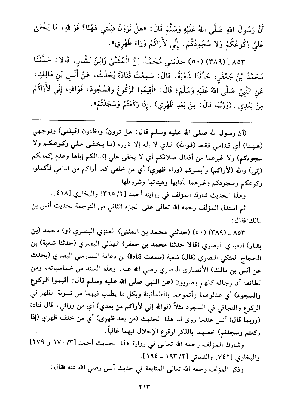 ٨٥٣ - (٣٨٩) (٥٠) حدَّثني مُحَمَّدُ بْنُ الْمُثَنَّى وَابْنُ بَشَّارٍ. قَالا: حَدَّثَنَا مُحَمَّدُ بْنُ جَعْفَرٍ، حَدَّثَنَا شُعْبَةُ. قَال: سَمِعْتُ قَتَادَةَ يُحدِّثُ، عَنْ أَنَسِ بْنِ مَالِكٍ، عَنِ النَّبِيِّ صَلَّى اللهُ عَلَيهِ وَسَلَّمَ؛ قَال: "أَقِيمُوا الرُّكُوعَ وَالسُّجُودَ، فَوَاللهِ، إِنِّي لأَرَاكُمْ مِنْ بَعْدِي. (وَرُبَّمَا قَال: مِنْ بَعْدِ ظَهْرِي). إِذَا رَكَعْتُمْ وَسَجَدْتُمْ"