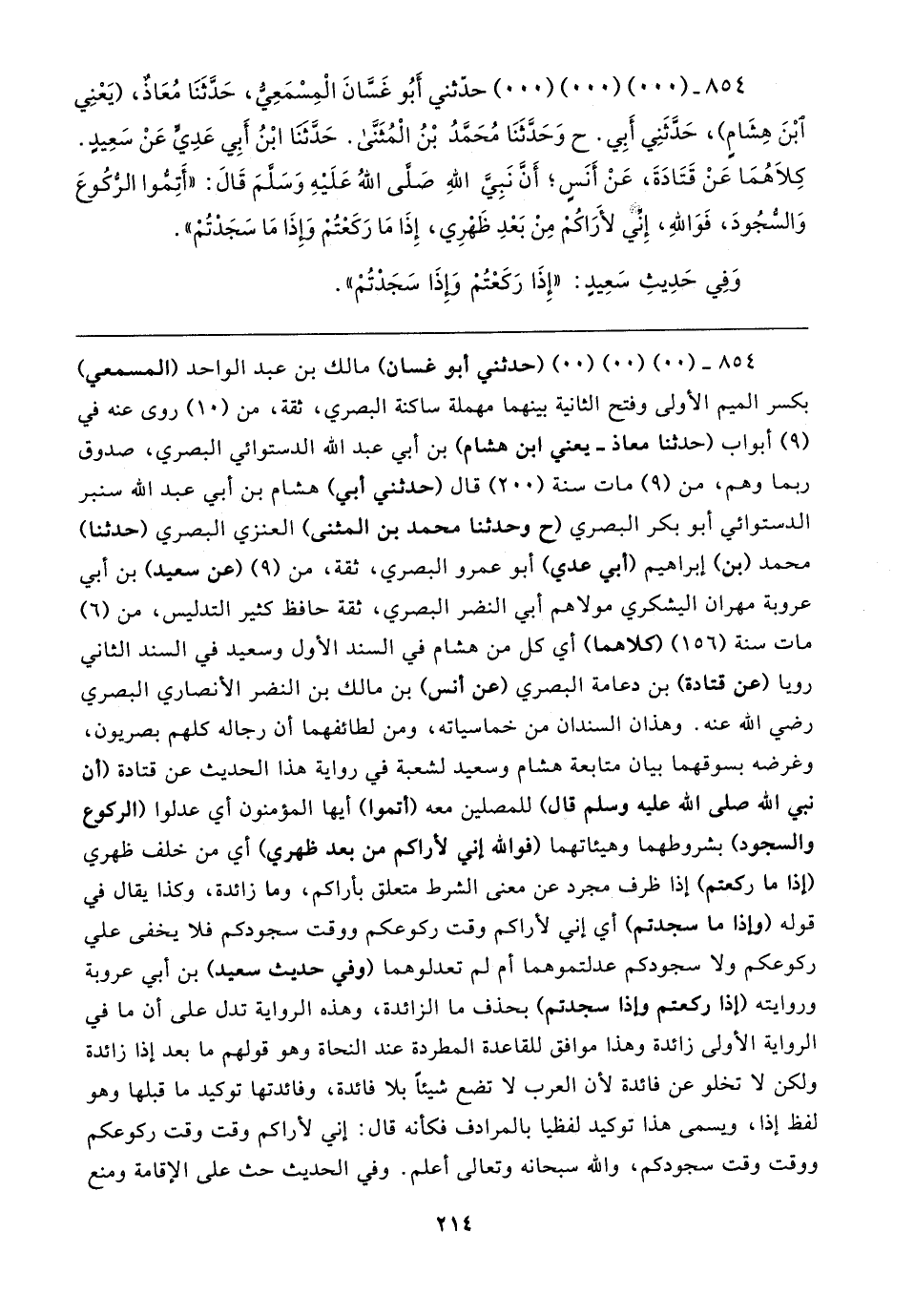 ٨٥٤ - (٠٠) (٠٠) (٠٠) (حدثني أبو غسان) مالك بن عبد الواحد (المسمعي) بكسر الميم الأولى وفتح الثانية بينهما مهملة ساكنة البصري، ثقة، من (١٠) روى عنه في (٩) أبواب (حَدَّثَنَا معاذ -يعني ابن هشام) بن أبي عبد الله الدستوائي البصري، صدوق ربما وهم، من (٩) مات سنة (٢٠٠) قال (حدثني أبي) هشام بن أبي عبد الله سنبر الدستوائي أبو بكر البصري (ح وحدثنا محمد بن المثنى) العنزي البصري (حَدَّثَنَا) محمد (بن) إبراهيم (أبي عدي) أبو عمرو البصري، ثقة، من (٩) (عن سعيد) بن أبي عروبة مهران اليشكري مولاهم أبي النضر البصري، ثقة حافظ كثير التدليس، من (٦) مات سنة (١٥٦) (كلاهما) أي كل من هشام في السند الأول وسعيد في السند الثاني رويا (عن قتادة) بن دعامة البصري (عن أنس) بن مالك بن النضر الأنصاري البصري رضي الله عنه. وهذان السندان من خماسياته، ومن لطائفهما أن رجاله كلهم بصريون، وغرضه بسوقهما بيان متابعة هشام وسعيد لشعبة في رواية هذا الحديث عن قتادة (أن نبي الله صلى الله عليه وسلم قال) للمصلين معه (أتموا) أيها المؤمنون أي عدلوا (الركوع والسجود) بشروطهما وهيئاتهما (فوالله إني لأراكم من بعد ظهري) أي من خلف ظهري (إذا ما ركعتم) إذا ظرف مجرد عن معنى الشرط متعلق بأراكم، وما زائدة، وكذا يقال في قوله (وإذا ما سجدتم) أي إني لأراكم وقت ركوعكم ووقت سجودكم فلا يخفى علي ركوعكم ولا سجودكم عدلتموهما أم لم تعدلوهما (وفي حديث سعيد) بن أبي عروبة وروايته (إذا ركعتم وإذا سجدتم) بحذف ما الزائدة، وهذه الرواية تدل على أن ما في الرواية الأولى زائدة وهذا موافق للقاعدة المطردة عند النحاة وهو قولهم ما بعد إذا زائدة ولكن لا تخلو عن فائدة لأن العرب لا تضع شيئًا بلا فائدة، وفائدتها توكيد ما قبلها وهو لفظ إذا، ويسمى هذا توكيد لفظيًّا بالمرادف فكأنه قال: إني لأراكم وقت وقت ركوعكم ووقت وقت سجودكم، والله سبحانه وتعالى أعلم. وفي الحديث حث على الإقامة ومع