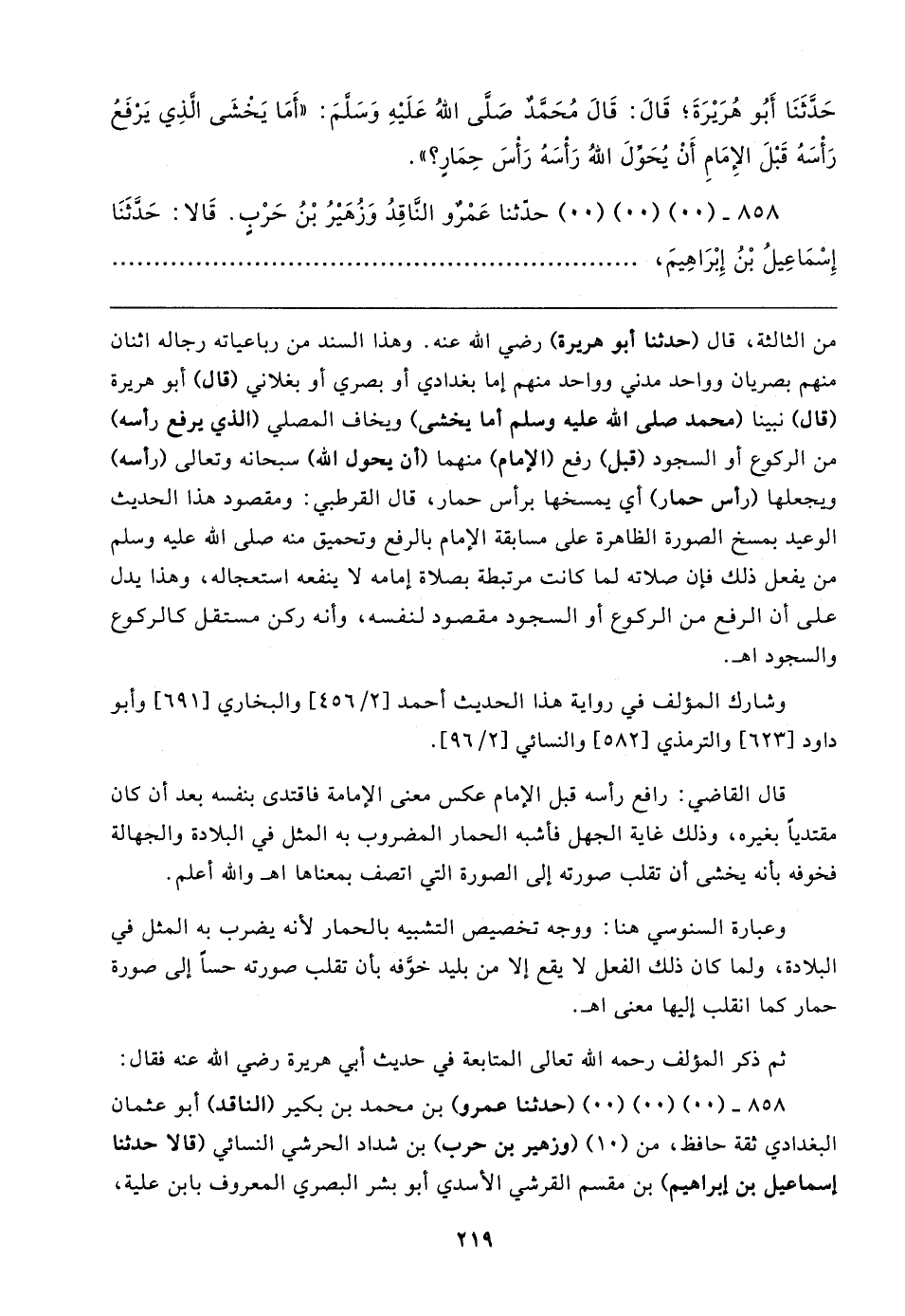 حَدَّثَنَا أَبُو هُرَيرَةَ؛ قَال: قَال مُحَمَّدٌ صَلَّى اللهُ عَلَيهِ وَسَلَّمَ: "أَمَا يَخْشَى الَّذِي يَرْفَعُ رَأسَهُ قَبْلَ الإِمَامِ أَنْ يُحَوِّلَ اللهُ رَأْسَهُ رَأْسَ حِمَارٍ؟ ".