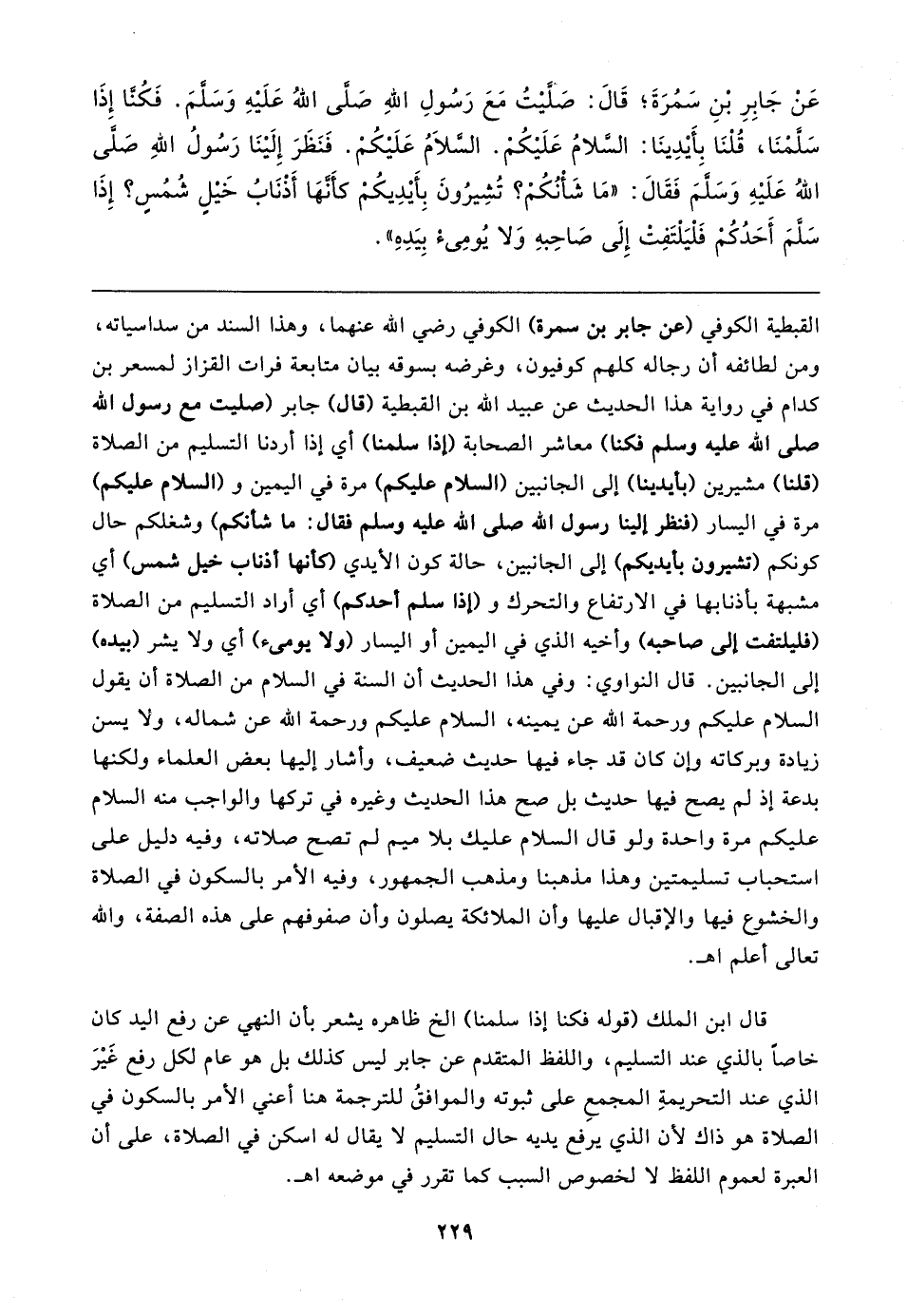 عَنْ جَابِرِ بْنِ سَمُرَةَ؛ قَال: صلَّيتُ مَعَ رَسُولِ اللهِ صَلَّى اللهُ عَلَيهِ وَسَلَّمَ. فَكُنَّا إِذَا سَلَّمْنَا، قُلْنَا بِأَيدِينَا: السَّلامُ عَلَيكُمْ. السَّلَامُ عَلَيكُمْ. فَنَظَرَ إِلَينَا رَسُولُ اللهِ صَلَّى اللهُ عَلَيهِ وَسَلَّمَ فَقَال: "مَا شَأْنُكُمْ؟ تُشِيرُونَ بِأَيدِيكُمْ كَأَنَّهَا أَذنَابُ خَيلٍ شُمُسٍ؟ إِذَا سَلَّمَ أَحَدُكُمْ فَلْيَلْتَفِتْ إِلَى صَاحِبهِ وَلا يُومِئْ بِيَدِهِ"