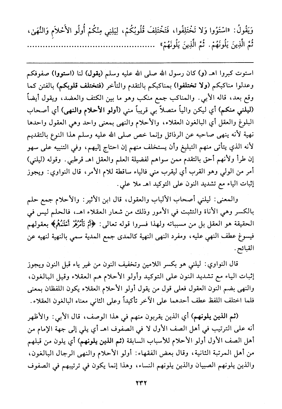 (ثم الذين يلونهم) أي الذين يقربون منهم في هذا الوصف، قال الأبي: والأظهر أنَّه على الترتيب في أهل الصف الأول لا في الصفوف اهـ أي يلي إلى جهة الإمام من أهل الصف الأول أولو الأحلام للأسباب السابقة (ثم الذين يلونهم) أي يلون من قبلهم من أهل المرتبة الثانية، وقال بعض الفقهاء: أولو الأحلام والنهى الرجال البالغون، والذين يلونهم الصبيان والذين يلونهم النساء، وهذا إنما يكون في ترتيبهم في الصفوف