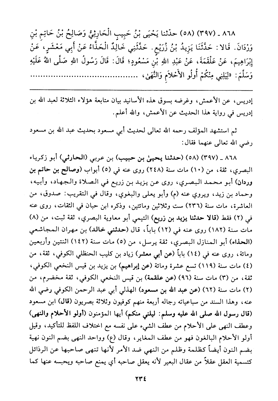 ٨٦٨ - (٣٩٧) (٥٨) (حَدَّثَنَا يحيى بن حبيب) بن عربي (الحارثي) أبو زكرياء البصري، ثقة، من (١٠) مات سنة (٢٤٨) روى عنه في (٥) أبواب (وصالح بن حاتم بن وردان) أبو محمد البصري، روى عن يزيد بن زريع في الصلاة والجهاد، وأبيه، وحماد بن زيد، ويروي عنه (م) وأبو يعلى والبغوي، وقال في التقريب: صدوق، من العاشرة، مات سنة (٢٣٦) ست وثلاثين ومائتين، وذكره ابن حبان في الثقات، روى عنه في (٢) فقط (قالا حَدَّثَنَا يزيد بن زريع) التيمي أبو معاوية البصري، ثقة ثبت، من (٨) مات سنة (١٨٢) روى عنه في (١٢) بابا، قال (حدثني خالد) بن مهران المجاشعي (الحذاء) أبو المنازل البصري، ثقة يرسل، من (٥) مات سنة (١٤٢) اثنتين وأربعين ومائة، روى عنه في (١٤) بابًا (عن أبي معشر) زياد بن كليب الحنظلي الكوفي، ثقة، من (٤) مات سنة (١١٩) تسع عشرة ومائة (عن إبراهيم) بن يزيد بن قيس النخعي الكوفي، ثقة، من (٣) مات سنة (٩٦) (عن علقمة) بن قيس النخعي الكوفي، ثقة مخضرم، من (٢) مات سنة (٦٢) (عن عبد الله بن مسعود) الهذلي أبي عبد الرحمن الكوفي رضي الله عنه، وهذا السند من سباعياته رجاله أربعة منهم كوفيون وثلاثة بصريون (قال) ابن مسعود (قال رسول الله صلى الله عليه وسلم: ليلني منكم) أيها المؤمنون (أولو الأحلام والنهى) وعطف النهي على الأحلام من عطف الشيء على نفسه مع اختلاف اللفظ للتأكيد، وقيل أولو الأحلام البالغون فهو من عطف المغاير، وقال (ع) وواحد النهي بضم النون نهية بضم النون أيضًا كظلمة وظلم من النهي ضد الأمر لأنها تنهى صاحبها عن الرذائل كتسمية العقل عقلًا من عقال البعير لأنه يعقل صاحبه أي يمنع صاحبه ويحبسه عنها كما