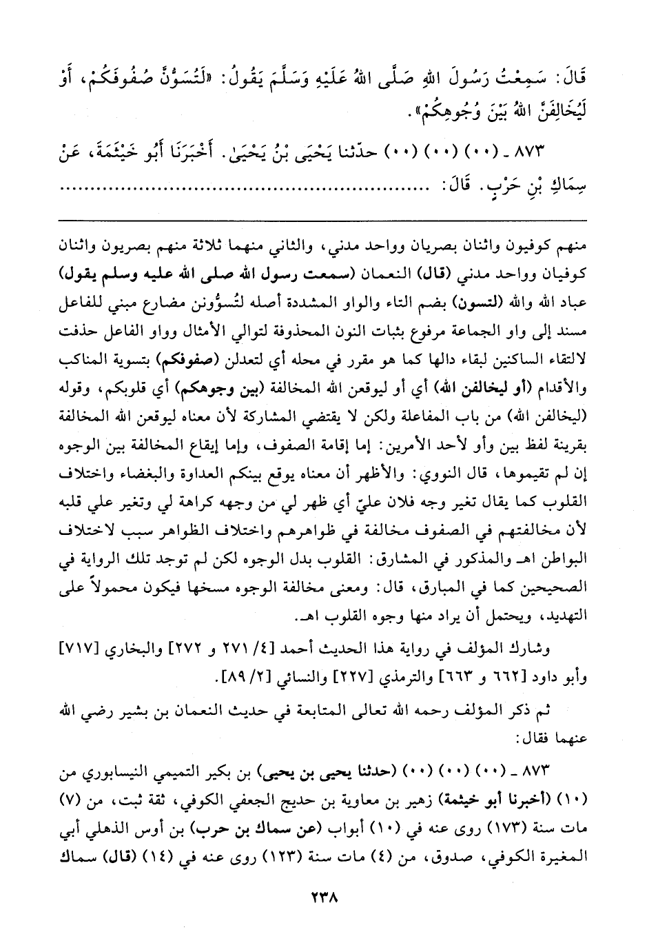 قَال: سَمِعْتُ رَسُولَ اللهِ صَلَّى اللهُ عَلَيهِ وَسَلَّمَ يَقُولُ: "لَتُسَوُّن صُفُوفَكُمْ، أَوْ لَيُخَالِفَنَّ اللهُ بَينَ وُجُوهِكُمْ".