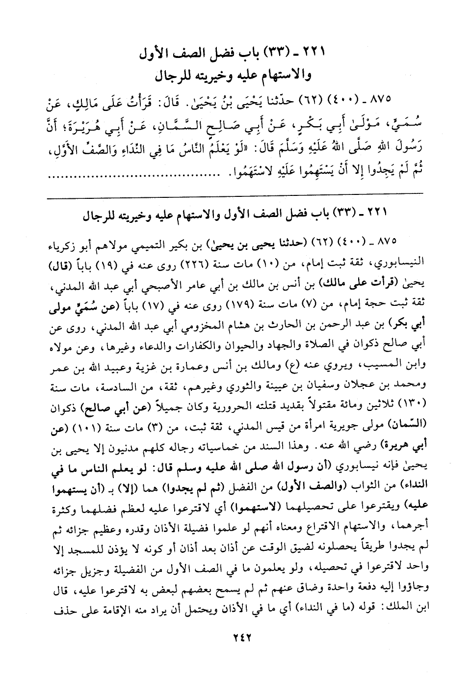 ٨٧٥ - (٤٠٠) (٦٢) حدَّثنا يَحْيَى بْنُ يَحْيَى. قَال: قَرَأْتُ عَلَى مَالِكٍ، عَنْ سُمَى، مَوْلَى أَبِي بَكْرٍ، عَنْ أَبِي صَالِحٍ السَّمَّانِ، عَنْ أَبِي هُرَيرَةَ؛ أَنَّ رَسُولَ اللهِ صَلَّى اللهُ عَلَيهِ وَسَلَّمَ قَال: "لَوْ يَعْلَمُ النَّاسُ مَا في النِّدَاءِ وَالصَّفِّ الأَوْلِ، ثُمَّ لَمْ يَجِدُوا إِلا أَنْ يَسْتَهِمُوا عَلَيهِ لاسْتَهَمُوا