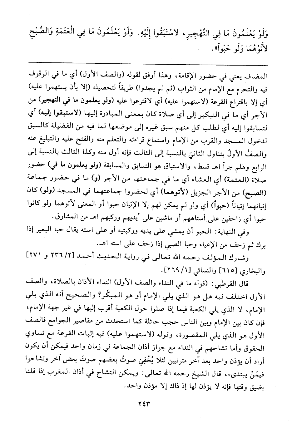 المضاف يعني في حضور الإقامة، وهذا أوفق لقوله (والصف الأول) أي ما في الوقوف فيه والتحرم مع الإمام من الثواب (ثم لم يجدوا) طريقا لتحصيله (إلا بأن يستهموا عليه) أي إلا باقتراع القرعة (لاستهموا عليه) أي لاقترعوا عليه (ولو يعلمون ما في التهجير) من الأجر أي ما في التبكير إلى أي صلاة كان بمعنى المبادرة إليها (لاستبقوا إليه) أي لتسابقوا إليه أي لطلب كل منهم سبق غيره إلى موضعها لما فيه من الفضيلة كالسبق لدخول المسجد والقرب من الإمام واستماع قراءته والتعلم منه والفتح عليه والتبليغ عنه والصف الأولُ يتناول الثانيَ بالنسبة إلى الثالث فإنه أول منه وكذا الثالث بالنسبة إلى الرابع وهلم جرًا اهـ قسط، والاستباق هو التسابق والمسابقة (ولو يعلمون ما في) حضور صلاة (العتمة) أي العشاء أي ما في جماعتها من الأجر (و) ما في حضور جماعة (الصبح) من الأجر الجزيل (لأتوهما) أي لحضروا جماعتهما في المسجد (ولو) كان إتيانهما إتيانًا (حبوًا) أي ولو لم يمكن لهم إلا الإتيان حبوا أو المعنى لأتوهما ولو كانوا حبوا أي زاحفين على أستاههم أو ماشين على أيديهم وركبهم اهـ من المشارق.