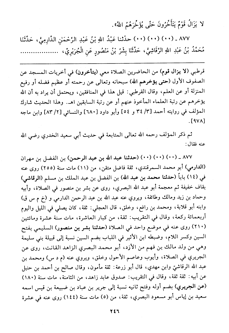 ٨٧٧ - (٠٠) (٠٠) (٠٠) (حدثنا عبد الله بن عبد الرحمن) بن الفضل بن مهران (الدارمي) أبو محمد السمرقندي، ثقة فاضل متقن، من (١١) مات سنة (٢٥٥) روى عنه في (١٤) بابا (حدثنا محمد بن عبد الله) بن الفضل بن عبد الملك بن مسلم (الرقاشي) بقاف خفيفة ثم معجمة أبو عبد الله البصري، روى عن بشر بن منصور في الصلاة، وأبيه وحماد بن زيد ومالك وطائفة، ويروي عنه عبد الله بن عبد الرحمن الدارمي و (خ م س ق) وابنه أبو قلابة، ومحمد بن رافع، وخلق، قال العجلي: ثقة، كان يصلي في الليل واليوم أربعمائة ركعة، وقال في التقريب: ثقة، من كبار العاشرة، مات سنة عشرة ومائتين (٢١٠) روى عنه في موضع واحد في الصلاة (حدثنا بشر بن منصور) السليمي بفتح السين وكسر اللام، وضبطه ابن الأثير في اللباب بضم السين نسبة إلى قبيلة بني سليمة وهي من ولد مالك بن فهم من الأزد، أبو محمد البصري الزاهد القانت، روى عن الجريري في الصلاة، وأيوب وعاصم الأحول وخلق، ويروي عنه (م دس) ومحمد بن عبد الله الرقاشي وابن مهدي، قال أبو زرعة: ثقة مأمون، وقال صالح بن أحمد بن حنبل عن أبيه: ثقة ثقة، وقال في التقريب: صدوق عابد زاهد، من الثامنة، مات سنة (١٨٠) (عن الجريري) بضم أوله وفتح ثانيه نسبة إلى جرير بن عباد بن ضبيعة بن قيس اسمه سعيد بن إياس أبو مسعود البصري، ثقة، من (٥) مات سنة (١٤٤) روى عنه في عشرة