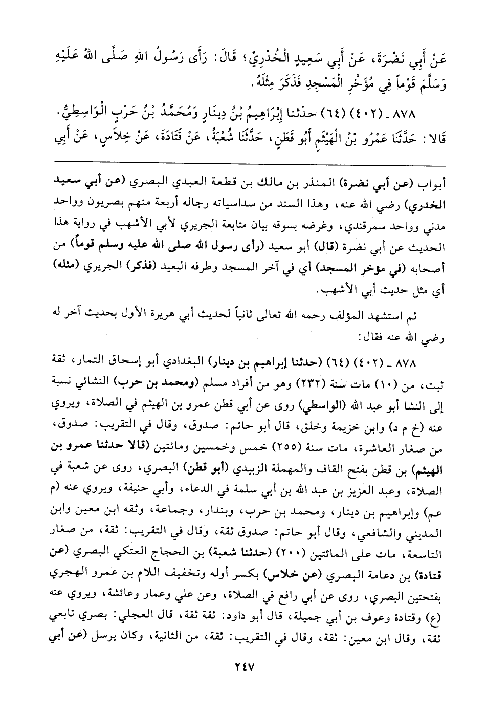 أبواب (عن أبي نضرة) المنذر بن مالك بن قطعة العبدي البصري (عن أبي سعيد الخدري) رضي الله عنه، وهذا السند من سداسياته رجاله أربعة منهم بصريون وواحد مدني وواحد سمرقندي، وغرضه بسوقه بيان متابعة الجريري لأبي الأشهب في رواية هذا الحديث عن أبي نضرة (قال) أبو سعيد (رأى رسول الله صلى الله عليه وسلم قومًا) من أصحابه (في مؤخر المسجد) أي في آخر المسجد وطرفه البعيد (فذكر) الجريري (مثله) أي مثل حديث أبي الأشهب.