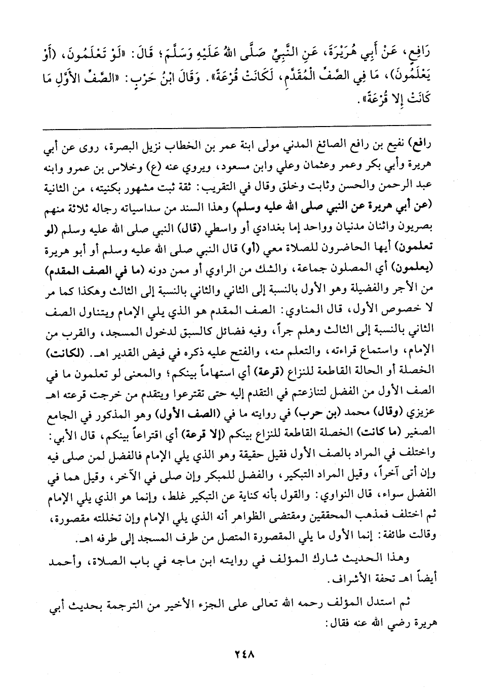 رَافِعٍ، عَنْ أَبِي هُرَيرَةَ، عَنِ النَّبِي صَلَى اللهُ عَلَيهِ وَسَلمَ؛ قَال: "لَو تَعلَمُونَ، (أوْ يَعْلَمُونَ)، مَا فِي الصف المُقَدَّمِ، لَكَانَتْ قُرعَةً". وَقَال ابْنُ حَرْبٍ: "الصف الأَولِ مَا كَانَتْ إِلا قُرعَةً"