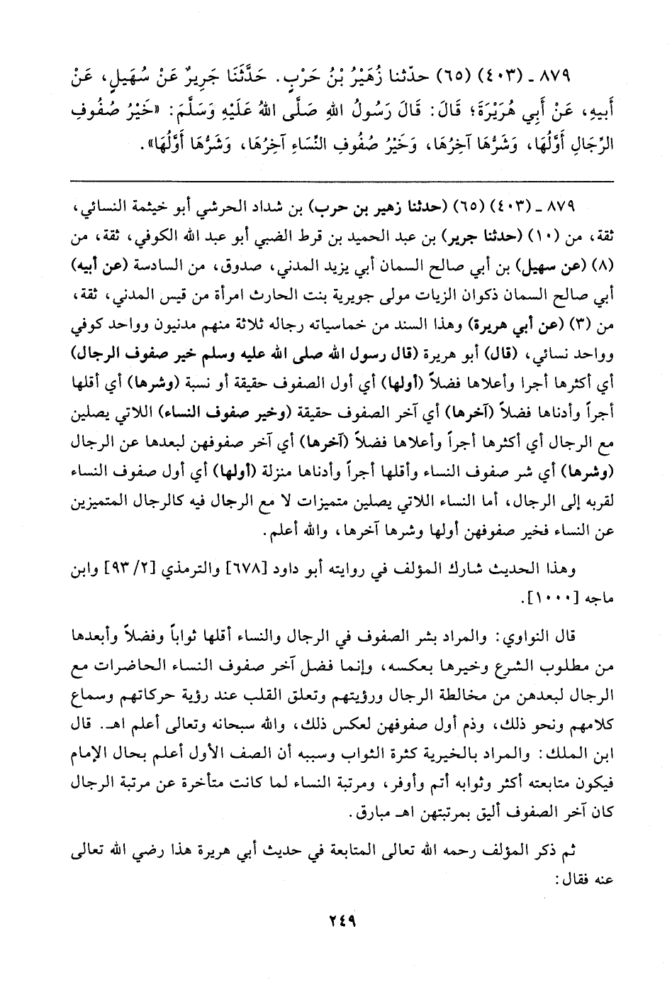 ٨٧٩ - (٤٠٣) (٦٥) (حدثنا زهير بن حرب) بن شداد الحرشي أبو خيثمة النسائي، ثقة، من (١٠) (حدثنا جرير) بن عبد الحميد بن قرط الضبي أبو عبد الله الكوفي، ثقة، من (٨) (عن سهيل) بن أبي صالح السمان أبي يزيد المدني، صدوق، من السادسة (عن أبيه) أبي صالح السمان ذكوان الزيات مولى جويرية بنت الحارث امرأة من قيس المدني، ثقة، من (٣) (عن أبي هريرة) وهذا السند من خماسياته رجاله ثلاثة منهم مدنيون وواحد كوفي وواحد نسائي، (قال) أبو هريرة (قال رسول الله صلى الله عليه وسلم خير صفوف الرجال) أي أكثرها أجرا وأعلاها فضلًا (أولها) أي أول الصفوف حقيقة أو نسبة (وشرها) أي أقلها أجرا وأدناها فضلًا (آخرها) أي آخر الصفوف حقيقة (وخير صفوف النساء) اللاتي يصلين مع الرجال أي أكثرها أجرًا وأعلاها فضلًا (آخرها) أي آخر صفوفهن لبعدها عن الرجال (وشرها) أي شر صفوف النساء وأقلها أجرًا وأدناها منزلة (أولها) أي أول صفوف النساء لقربه إلى الرجال، أما النساء اللاتي يصلين متميزات لا مع الرجال فيه كالرجال المتميزين عن النساء فخير صفوفهن أولها وشرها آخرها، والله أعلم.