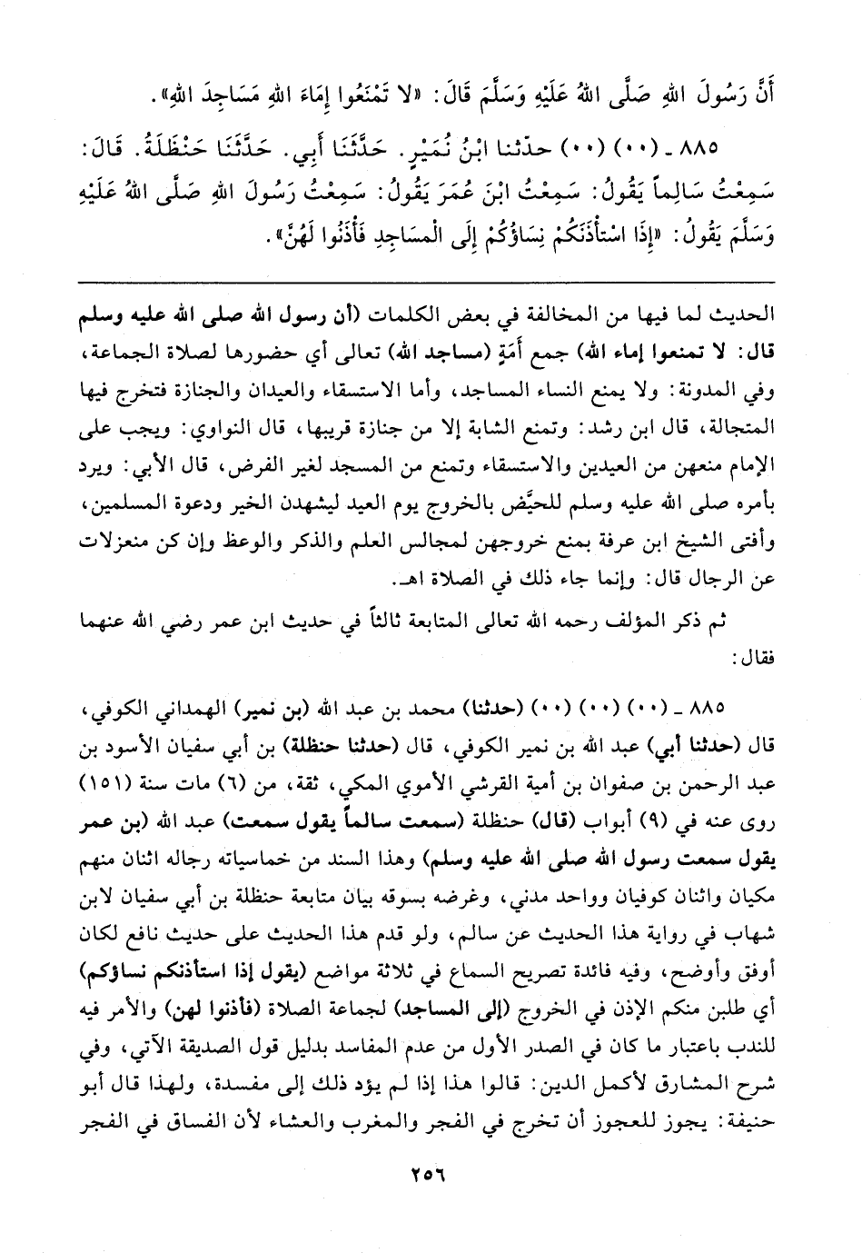 ٨٨٥ - (٠٠) (٠٠) حدَّثنا ابْنُ نُمَيرٍ. حَدَّثَنَا أَبِي. حَدَّثَنَا حَنْظَلَةُ. قَال: سَمِعْتُ سَالِمًا يَقُولُ: سَمِعْتُ ابْنَ عُمَرَ يَقُولُ: سَمِعْتُ رَسُولَ اللهِ صَلى اللهُ عَلَيهِ وَسَلمَ يَقُولُ: "إِذَا اسْتأذَنَكُمْ نِسَاؤُكُمْ إِلَى الْمسَاجِدِ فَأذَنُوا لَهُن"