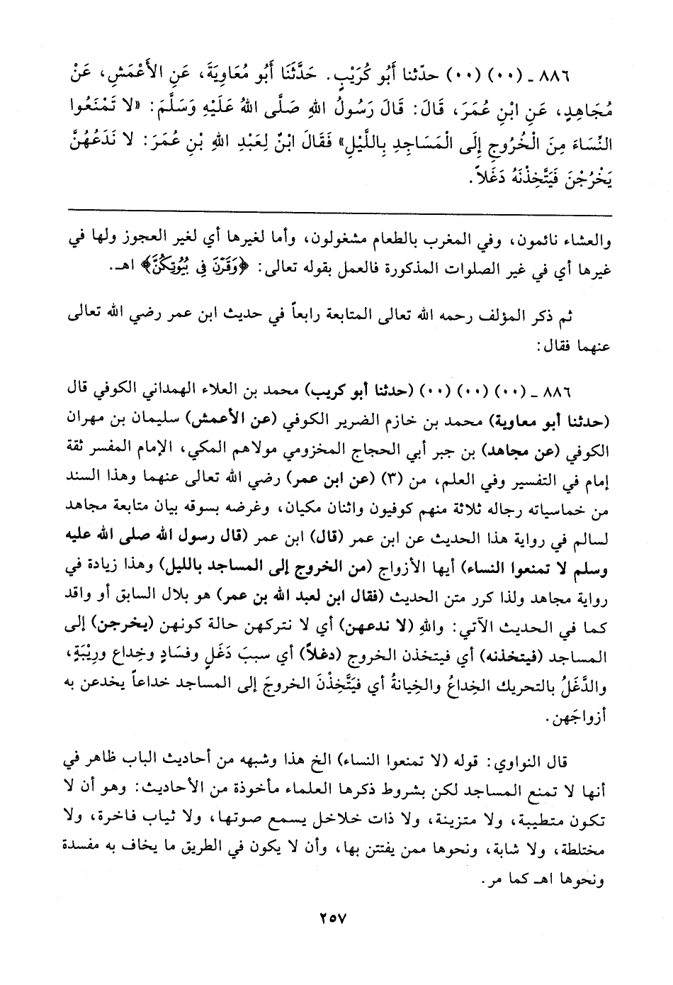 ٨٨٦ - (٠٠) (٠٠) (٠٠) (حدثنا أبو كريب) محمد بن العلاء الهمداني الكوفي قال (حدثنا أبو معاوية) محمد بن خازم الضرير الكوفي (عن الأعمش) سليمان بن مهران الكوفي (عن مجاهد) بن جبر أبي الحجاج المخزومي مولاهم المكي، الإمام المفسر ثقة إمام في التفسير وفي العلم، من (٣) (عن ابن عمر) رضي الله تعالى عنهما وهذا السند من خماسياته رجاله ثلاثة منهم كوفيون واثنان مكيان، وغرضه بسوقه بيان متابعة مجاهد لسالم في رواية هذا الحديث عن ابن عمر (قال) ابن عمر (قال رسول الله صلى الله عليه وسلم لا تمنعوا النساء) أيها الأزواج (من الخروج إلى المساجد بالليل) وهذا زيادة في رواية مجاهد ولذا كرر متن الحديث (فقال ابن لعبد الله بن عمر) هو بلال السابق أو واقد كما في الحديث الآتي: واللهِ (لا ندعهن) أي لا نتركهن حالة كونهن (يخرجن) إلى المساجد (فيتخذنه) أي فيتخذن الخروج (دغلًا) أي سببَ دَغَلٍ وفسَادٍ وخِداع ورِيبَة، والدغَلُ بالتحريك الخِداعُ والخِيانةُ أي فيَتَّخِذْنَ الخروجَ إلى المساجد خداعًا يخدعن به أزواجَهن.
