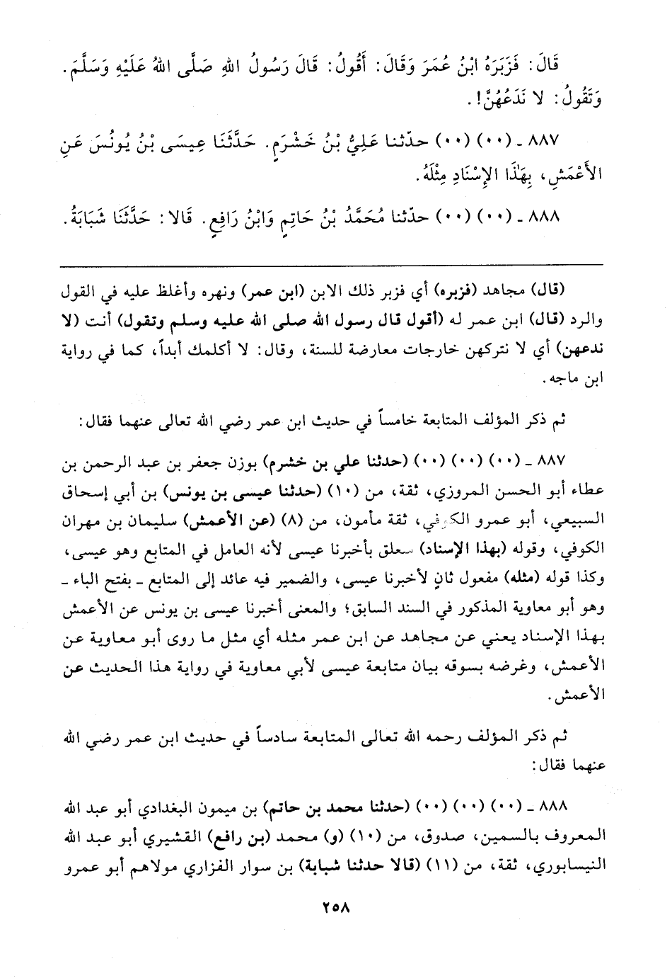 ٨٨٧ - (٠٠) (٠٠) (٠٠) (حدثنا علي بن خشرم) بوزن جعفر بن عبد الرحمن بن عطاء أبو الحسن المروزي، ثقة، من (١٠) (حدثنا عيسى بن يونس) بن أبي إسحاق السبيعي، أبو عمرو الكوفي، ثقة مأمون، من (٨) (عن الأعمش) سليمان بن مهران الكوفي، وقوله (بهذا الإسناد) متعلق بأخبرنا عيسى لأنه العامل في المتابع وهو عيسى، وكذا قوله (مثله) مفعول ثانٍ لأخبرنا عيسى، والضمير فيه عائد إلى المتابع -بفتح الباء- وهو أبو معاوية المذكور في السند السابق؛ والمعنى أخبرنا عيسى بن يونس عن الأعمش بهذا الإسناد يعني عن مجاهد عن ابن عمر مثله أي مثل ما روى أبو معاوية عن الأعمش، وغرضه بسوقه بيان متابعة عيسى لأبي معاوية في رواية هذا الحديث عن الأعمش.
