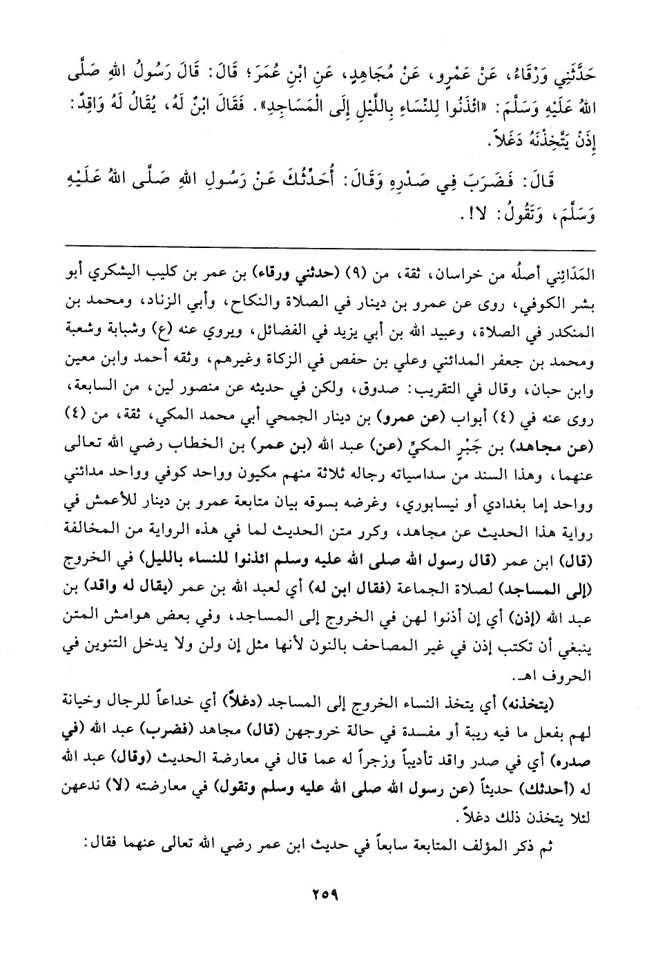 حَدَّثَنِي وَرْقَاءُ، عَنْ عَمْرٍو، عَنْ مُجَاهِدٍ، عَنِ ابْنِ عُمَرَ؛ قَال: قَال رَسُولُ اللهِ صَلى اللهُ عَلَيهِ وَسَلمَ: "ائذَنُوا لِلنِّسَاءِ بِالليلِ إِلَى المَسَاجِدِ". فَقَال ابْنْ لَهُ، يُقَالُ لَهُ وَاقِدٌ: إِذَنْ يَتَّخِذْنَهُ دَغَلًا.