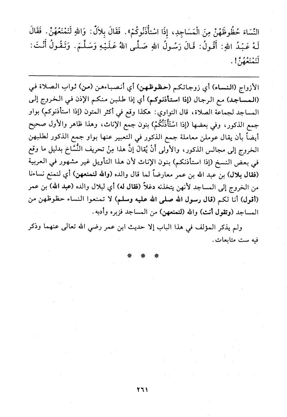 النِّسَاءَ حُظُوظَهُنَّ مِنَ الْمَسَاجِدِ، إِذَا اسْتأذَنُوكُمْ". فَقَال بِلال: وَاللهِ لَنَمْنَعُهُن. فَقَال لَهُ عَبْدُ اللهِ: أَقُولُ: قَال رَسُولُ اللهِ صَلى اللهُ عَلَيهِ وَسَلمَ. وَتَقُولُ أَنْتَ: لَنَمنَعُهُنَّ!