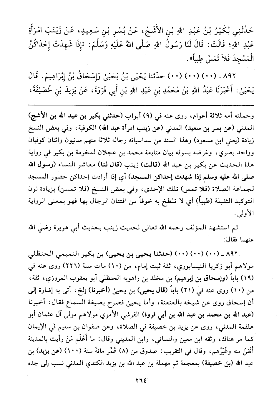 حَدثَنِي بُكَيرُ بْنُ عَبْدِ اللهِ بْنِ الأَشَج، عَنْ بُسْرِ بْنِ سَعِيدٍ، عَنْ زَينَبَ امْرَأَةِ عَبْدِ اللهِ؛ قَالتْ: قَال لَنَا رَسُولُ اللهِ صَلى اللهُ عَلَيهِ وَسَلمَ: "إِذَا شَهِدَتْ إِحْدَاكُن الْمَسْجِدَ فَلَا تَمس طِيبا".