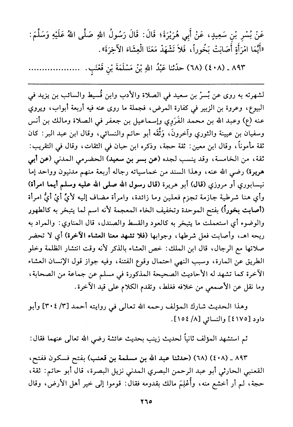 عَنْ بُسْرِ بْنِ سَعِيدٍ، عَنْ أَبِي هُرَيرَةَ؛ قَال: قَال رَسُولُ اللهِ صَلى اللهُ عَلَيهِ وَسَلمَ: "أَيُّمَا امْرَأَةِ أَصَابَتْ بَخُورًا، فَلَا تَشْهَدْ مَعَنَا الْعِشَاءَ الآخِرَةَ".