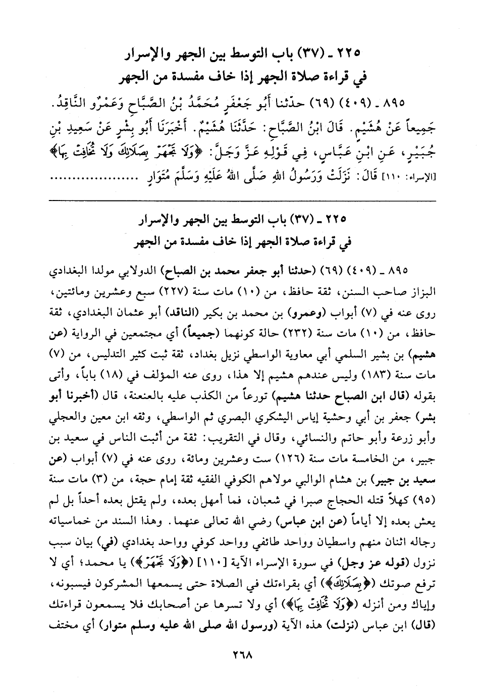 ٨٩٥ - (٤٠٩) (٦٩) حدثنا أَبُو جَعْفَرٍ مُحَمدُ بْنُ الصباحِ وَعَمْرٌو الناقِدُ. جَمِيعًا عَنْ هُشَيمٍ. قَال ابْنُ الصَّبَاحِ: حَدَّثَنَا هُشيمٌ. أَخْبَرَنَا أَبُو بِشْرٍ عَنْ سَعِيدِ بْنِ جُبَيرٍ، عَنِ ابْنِ عَباسٍ، فِي قَوْلِهِ عَزَّ وَجَلَّ: {وَلَا تَجْهَرْ بِصَلَاتِكَ وَلَا تُخَافِتْ بِهَا} [الإسراء: ١١٠] قَال: نَزَلَتْ وَرَسُولُ اللهِ صَلَى اللهُ عَلَيهِ وَسَلمَ مُتَوَارٍ