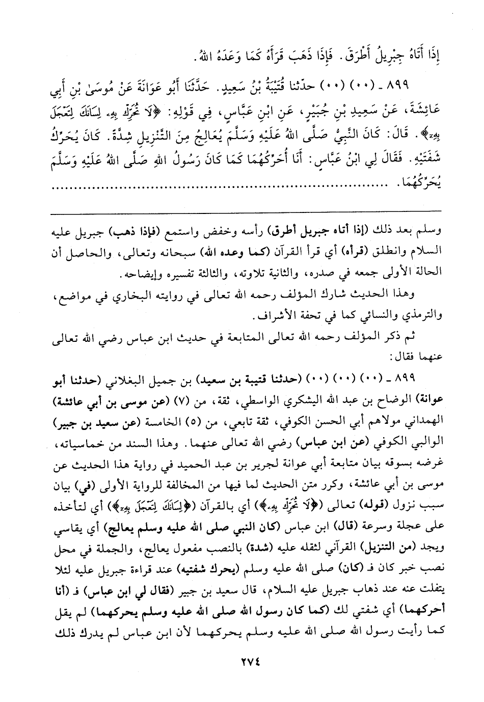 ٨٩٩ - (٠٠) (٠٠) حدثنا قُتَيبَةُ بن سَعِيدٍ. حَدَّثَنَا أَبُو عَوَانَةَ عَنْ مُوسَى بْنِ أَبِي عَائِشَةَ، عَنْ سعِيدِ بْنِ جُبَيرٍ، عَنِ ابْنِ عَباس، فِي قَوْلِهِ: {لَا تُحَرِّكْ بِهِ لِسَانَكَ لِتَعْجَلَ بِهِ}. قَال: كَانَ النبِي صَلَى اللهُ عَلَيهِ وَسَلمَ يُعَالِجُ مِنَ التنْزِيلِ شِدة. كَانَ يُحَرِّكُ شَفَتَيهِ. فَقَال لِي ابْنُ عَباس: أَنَا أُحَرِّكُهُمَا كَمَا كَانَ رَسُولُ اللهِ صَلى اللهُ عَلَيهِ وَسَلمَ يُحَرِّكُهُمَا