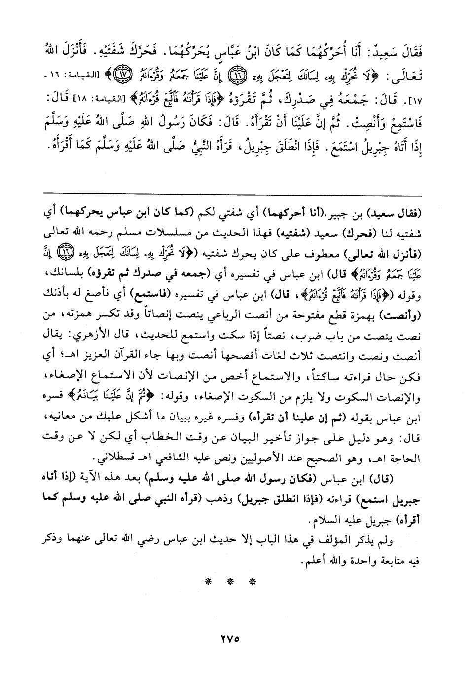 فَقَال سَعِيدٌ: أَنَا أُحَرِّكُهُمَا كَمَا كَانَ ابْنُ عَباسٍ يُحَرِّكُهُمَا. فَحَركَ شَفَتَيهِ. فَأَنْزَلَ اللهُ تَعَالى: {لَا تُحَرِّكْ بِهِ لِسَانَكَ لِتَعْجَلَ بِهِ (١٦) إِنَّ عَلَينَا جَمْعَهُ وَقُرْآنَهُ (١٧)} [القيامة: ١٦ - ١٧]. قَال: جَمْعَهُ فِي صَدْرِكَ، ثُمَّ تَقْرَؤهُ {فَإِذَا قَرَأْنَاهُ فَاتَّبِعْ قُرْآنَهُ} [القيامة: ١٨] قَال: فَاسْتَمِعْ وَأَنْصِتْ. ثُمَّ إنَّ عَلَينَا أَنْ تَقْرَأهُ. قَال: فَكَانَ رَسُولُ اللهِ صَلى اللهُ عَلَيهِ وَسَلمَ إِذَا أَتَاهُ جِبْرِيلُ اسْتَمَعَ. فَإِذَا انْطَلَقَ جِبْرِيلُ، قَرَأَهُ النبِي صَلى اللهُ عَلَيهِ وَسَلمَ كَمَا أَقْرَأَهُ