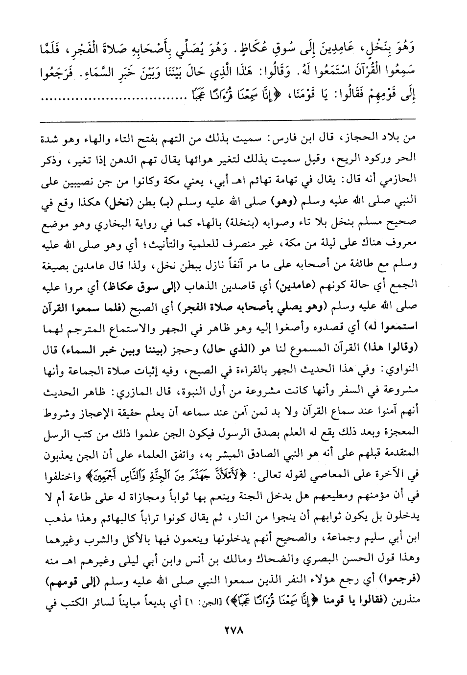 وَهُوَ بِنَخْلٍ، عَامِدِينَ إِلَى سُوقِ عُكَاظٍ. وَهُوَ يُصَلِّي بِأصْحَابِهِ صَلاةَ الْفَجْرِ، فَلَمَّا سَمِعُوا الْقُرْآنَ اسْتَمَعُوا لَهُ. وَقَالُوا: هَذَا الَّذِي حَال بَينَنَا وَبَينَ خَبَرِ السمَاءِ. فَرَجَعُوا إِلَى قَوْمِهِمْ فَقَالُوا: يَا قَوْمَنَا، {إِنَّا سَمِعْنَا قُرْآنًا عَجَبًا