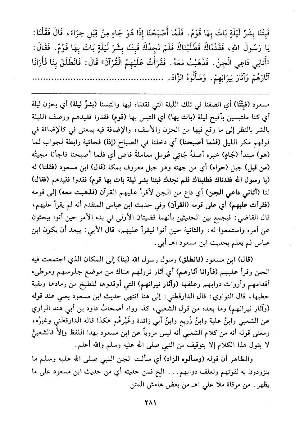 فَبِتْنَا بِشَرِّ لَيلَةٍ بَاتَ بِهَا قَوْمٌ. فَلَما أصْبَحْنَا إِذَا هُوَ جَاءِ مِنْ قِبَلِ حِرَاءَ، قَال فَقُلْنَا: يَا رَسُولَ اللهِ، فَقَدْنَاكَ فَطَلَبْنَاكَ فَلَمْ نَجِدْكَ فَبِتْنَا بِشَرِّ لَيلَةٍ بَاتَ بِهَا قَوْم. فَقَال: "أَتَانِي دَاعِي الْجِنِّ. فَذَهَبتُ مَعَهُ. فَقَرَأْتُ عَلَيهِمُ الْقُرْآنَ" قَال: فَانْطَلَقَ بِنَا فَأَرَانَا آثَارَهُمْ وَآثَارَ نِيرَانِهِمْ. وَسَأَلُوهُ الزَّادَ