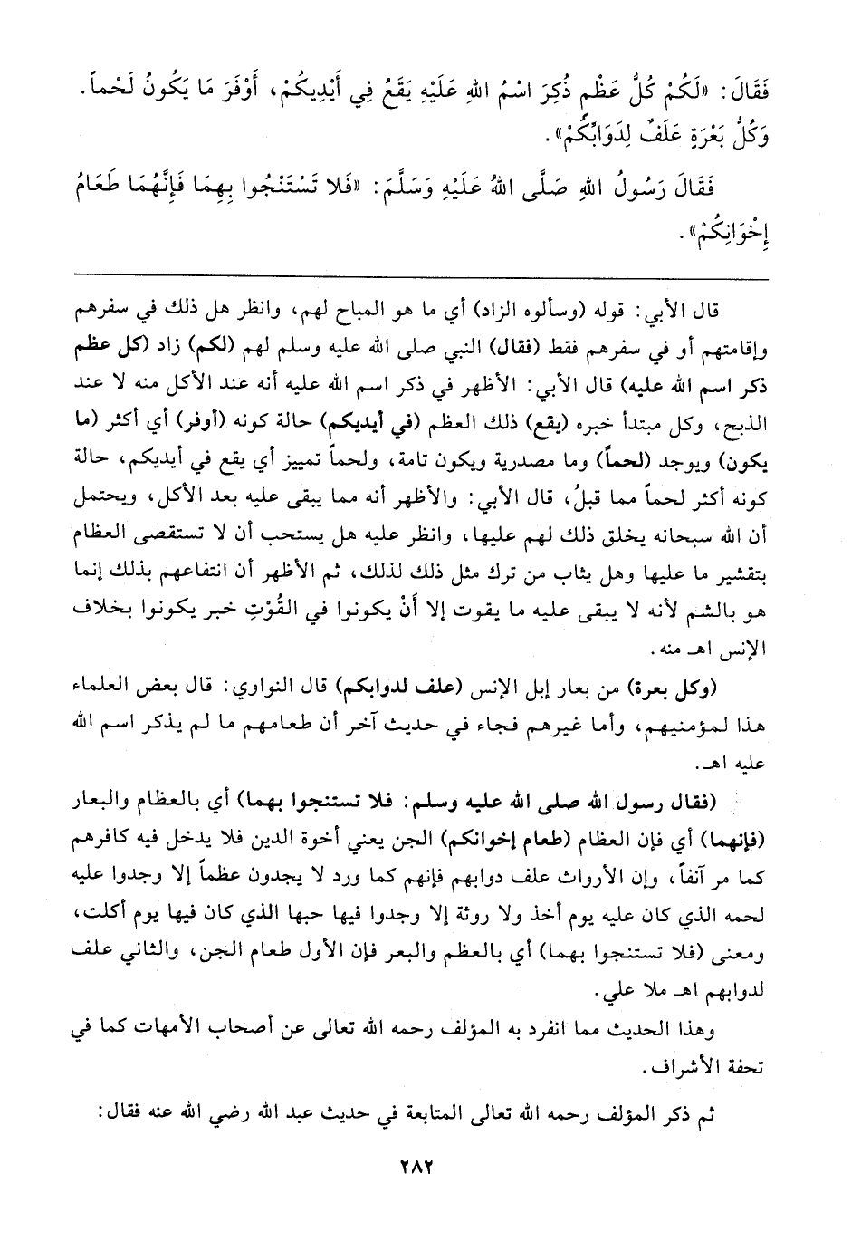 قال الأبي: قوله (وسألوه الزاد) أي ما هو المباح لهم، وانظر هل ذلك في سفرهم وإقامتهم أو في سفرهم فقط (فقال) النبي صلى الله عليه وسلم لهم (لكم) زاد (كل عظم ذكر اسم الله عليه) قال الأبي: الأظهر في ذكر اسم الله عليه أنه عند الأكل منه لا عند الذبح، وكل مبتدأ خبره (يقع) ذلك العظم (في أيديكم) حالة كونه (أوفر) أي أكثر (ما يكون) ويوجد (لحمًا) وما مصدرية ويكون تامة، ولحما تمييز أي يقع في أيديكم، حالة كونه أكثر لحما مما قبلُ، قال الأبي: والأظهر أنه مما يبقى عليه بعد الأكل، ويحتمل أن الله سبحانه يخلق ذلك لهم عليها، وانظر عليه هل يستحب أن لا تستقصى العظام بتقشير ما عليها وهل يثاب من ترك مثل ذلك لذلك، ثم الأظهر أن انتفاعهم بذلك إنما هو بالشم لأنه لا يبقى عليه ما يقوت إلا أَنْ يكونوا في القُوْتِ خبر يكونوا بخلاف الإنس اهـ منه.