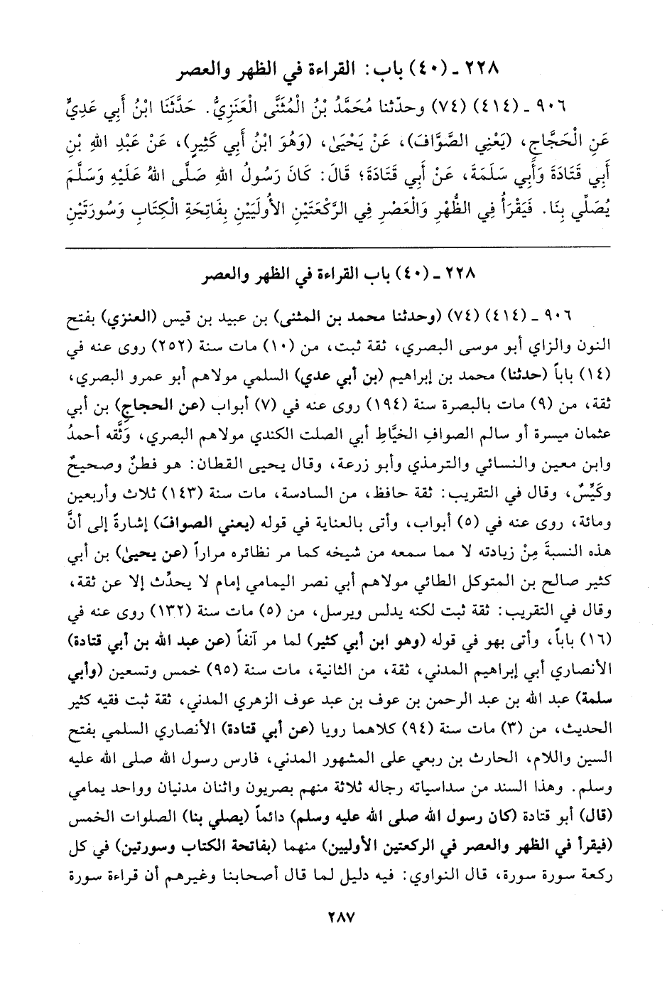 ٩٠٦ - (٤١٤) (٧٤) (وحدثنا محمد بن المثنى) بن عبيد بن قيس (العنزي) بفتح النون والزاي أبو موسى البصري، فقة ثبت، من (١٠) مات سنة (٢٥٢) روى عنه في (١٤) بابا (حدثنا) محمد بن إبراهيم (بن أبي عدي) السلمي مولاهم أبو عمرو البصري، ثقة، من (٩) مات بالبصرة سنة (١٩٤) روى عنه في (٧) أبواب (عن الحجاجِ) بن أبي عثمان ميسرة أو سالم الصوافِ الخيَّاطِ أبي الصلت الكندي مولاهم البصري، وَثَّقه أحمدُ وابن معين والنسائي والترمذي وأبو زرعة، وقال يحيى القطان: هو فطنٌ وصحيحٌ وكَيِّسٌ، وقال في التقريب: ثقة حافظ، من السادسة، مات سنة (١٤٣) ثلاث وأربعين ومائة، روى عنه في (٥) أبواب، وأتى بالعناية في قوله (يعني الصوافَ) إشارةً إلى أن هذه النسبةَ مِنْ زيادته لا مما سمعه من شيخه كما مر نظائره مرارا (عن يحيى) بن أبي كثير صالح بن المتوكل الطائي مولاهم أبي نصر اليمامي إمام لا يحدِّث إلا عن ثقة، وقال في التقريب: ثقة ثبت لكنه يدلس ويرسل، من (٥) مات سنة (١٣٢) روى عنه في (١٦) بابا، وأتى بهو في قوله (وهو ابن أبي كثير) لما مر آنفًا (عن عبد الله بن أبي قتادة) الأنصاري أبي إبراهيم المدني، ثقة، من الثانية، مات سنة (٩٥) خمس وتسعين (وأبي سلمة) عبد الله بن عبد الرحمن بن عوف بن عبد عوف الزهري المدني، ثقة ثبت فقيه كثير الحديث، من (٣) مات سنة (٩٤) كلاهما رويا (عن أبي قتادة) الأنصاري السلمي بفتح السين واللام، الحارث بن ربعي على المشهور المدني، فارس رسول الله صلى الله عليه وسلم. وهذا السند من سداسياته رجاله ثلاثة منهم بصريون واثنان مدنيان وواحد يمامي (قال) أبو قتادة (كان رسول الله صلى الله عليه وسلم) دائمًا (يصلي بنا) الصلوات الخمس (فيقرأ في الظهر والعصر في الركعتين الأوليين) منهما (بفاتحة الكتاب وسورتين) في كل ركعة سورة سورة، قال النواوي: فيه دليل لما قال أصحابنا وغيرهم أن قراءة سورة