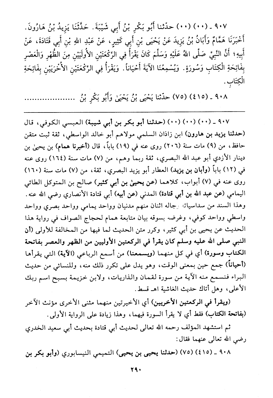 ٩٠٧ - (٠٠) (٠٠) حدثنا أَبُو بَكْرِ بْنُ أَبِي شَيبَةَ. حَدَّثَنَا يَزِيدُ بْنُ هَارُونَ. أَخْبَرَنَا هَمامٌ وَأَبَانُ بْنُ يَزِيدَ عَنْ يَحْيَى بْنِ أَبِي كَثِيرٍ، عَنْ عَبْدِ اللهِ بْنِ أَبِي قَتَادَةَ، عَنْ أَبِيهِ؛ أَن النَّبِيّ صَلَى اللهُ عَلَيهِ وَسَلمَ كَانَ يَقْرَأُ فِي الركْعَتَينِ الأوُلَيَينِ مِنَ الظُّهْرِ وَالْعَصْرِ بِفَاتِحَةِ الْكِتَابِ وَسُورَة. وَيُسْمِعُنَا الآيَةَ أَحْيَانًا. وَيَقْرَأُ فِي الركْعَتَينِ الأخرَيَينِ بِفَاتِحَةِ الْكِتَابِ.