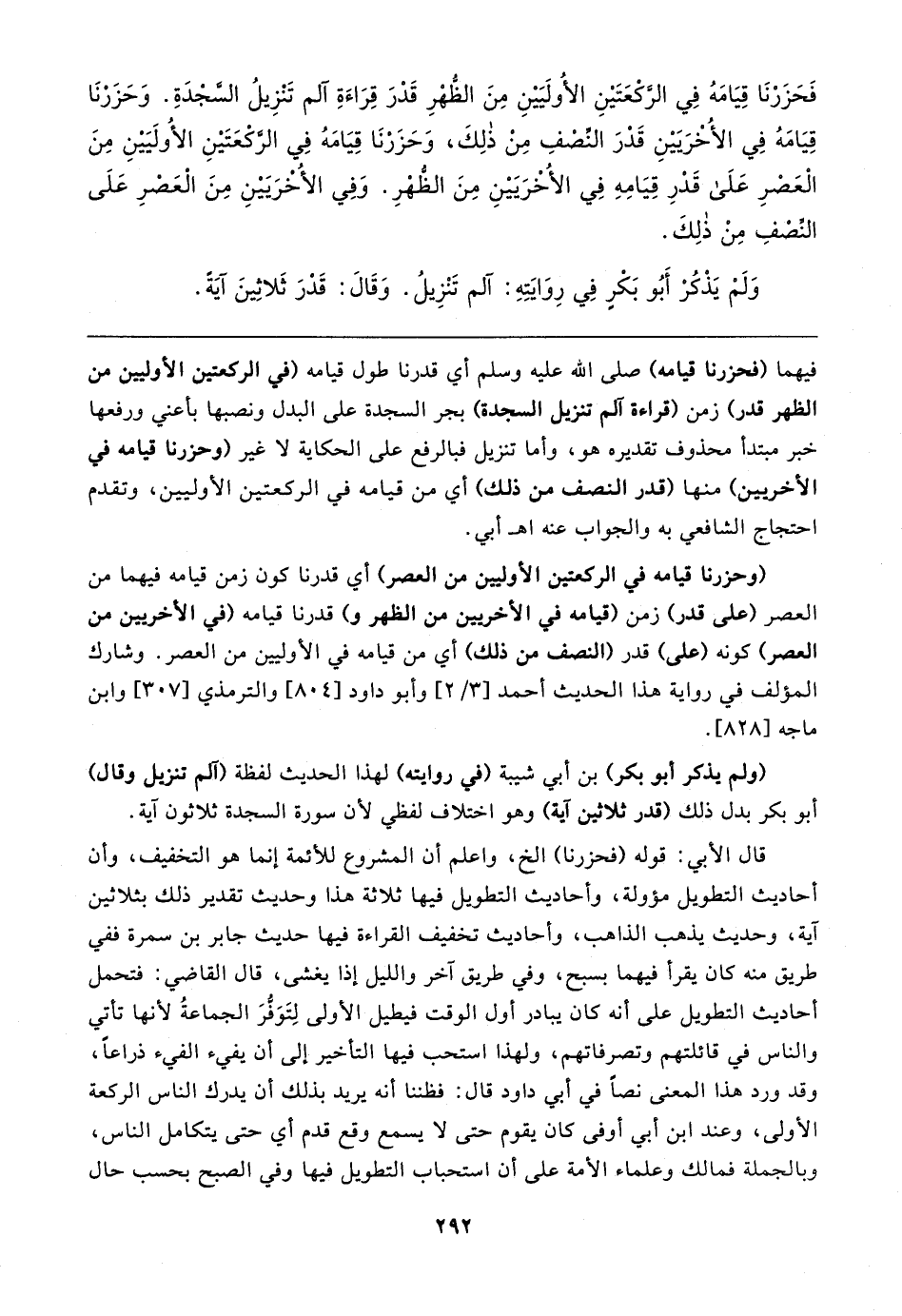 فَحَزَرْنَا قِيَامَهُ فِي الركْعَتَينِ الأُولَيَينِ مِنَ الظُّهْرِ قَدْرَ قِرَاءَةِ الم تَتزِيلُ السجْدَةِ. وَحَزَرْنَا قِيَامَهُ فِي الأخرَيَينِ قَدْرَ النصْفِ مِنْ ذلِكَ، وَحَزَرْنَا قِيَامَهُ فِي الؤكْعَتَينِ الأُولَيَينِ مِنَ الْعَصْرِ عَلَى قَدْرِ قِيَامِهِ فِي الأُخْرَيَينِ مِنَ الظُّهْرِ. وَفِي الأُخرَيَينِ مِنَ الْعَصْرِ عَلَى النصْفِ مِنْ ذلِكَ.