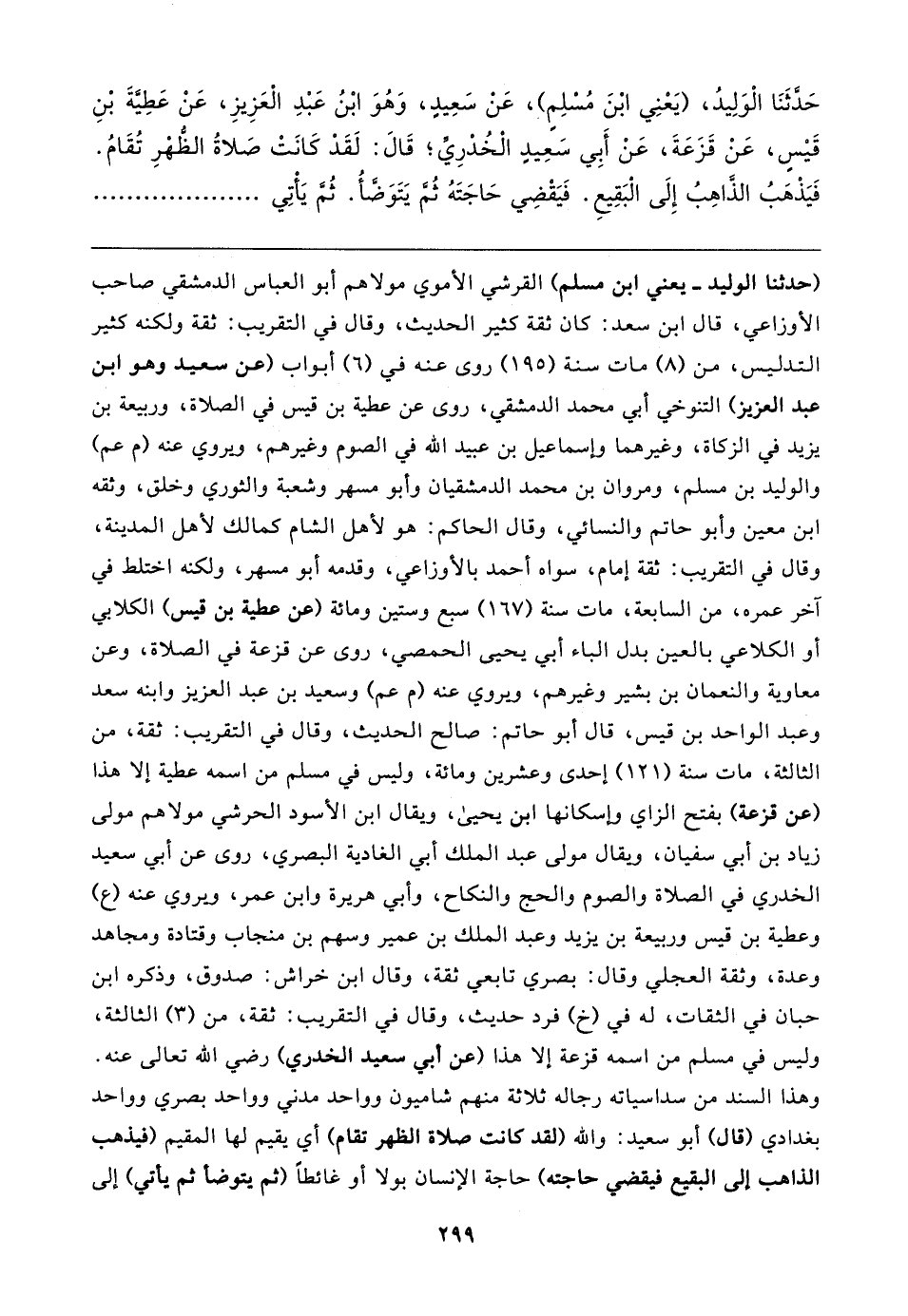 حَدَّثَنَا الْوَلِيدُ، (يَعْنِي ابْنَ مُسْلِمٍ)، عَنْ سَعِيدٍ، وَهُوَ ابْنُ عَبْدِ الْعَزِيزِ، عَنْ عَطِيَّةَ بْنِ قَيسٍ، عَنْ قَزَعَةَ، عَنْ أَبِي سَعِيدٍ الْخُدْرِيِّ؛ قَال: لَقَدْ كَانَتْ صَلاةُ الظُّهْرِ تُقَامُ. فَيَذْهَبُ الذَّاهِبُ إِلَى الْبَقِيعِ. فَيَقْضِي حَاجَتَهُ ثُمَّ يَتَوَضَّأُ. ثُمَّ يَأْتِي