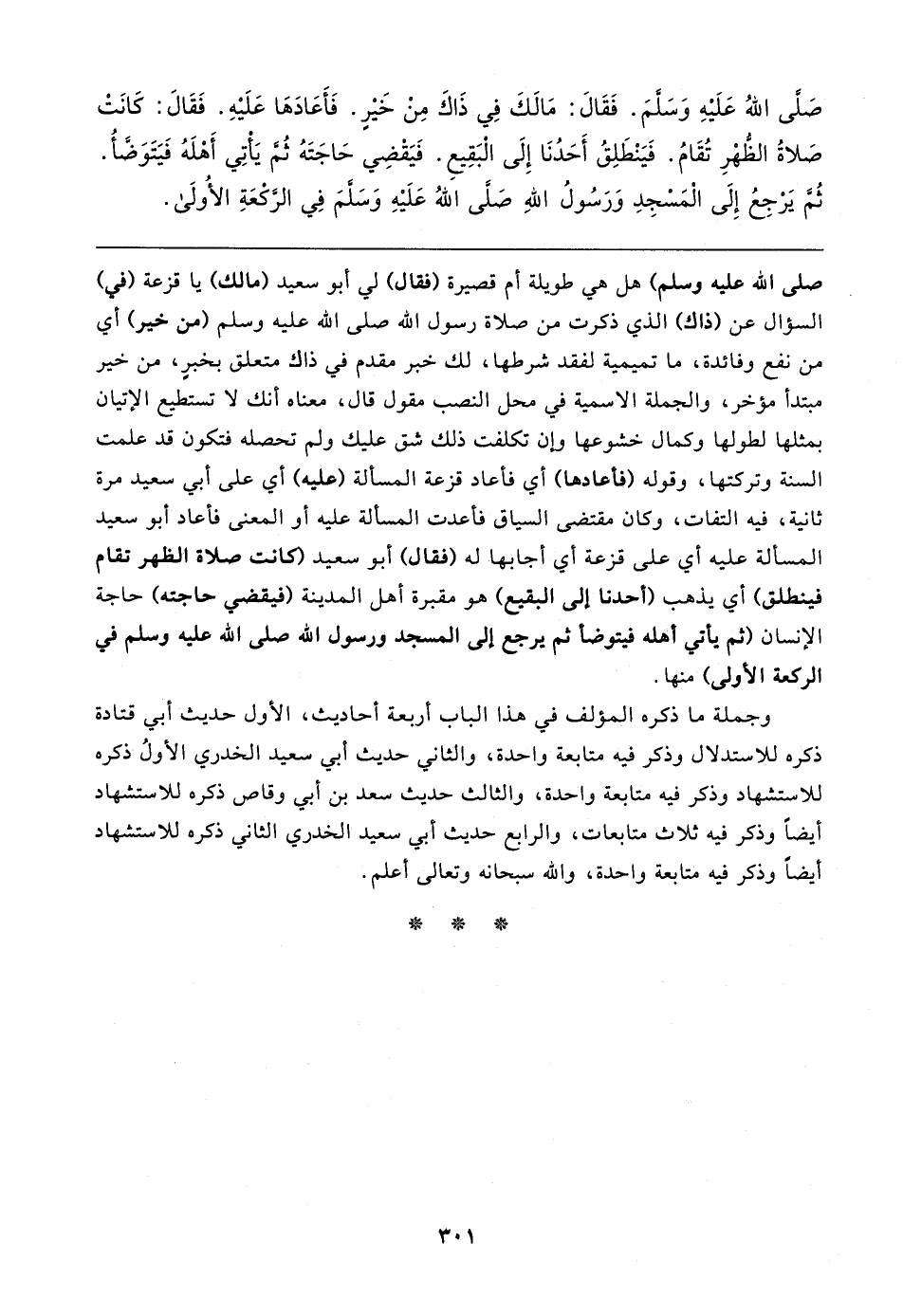 - صَلَّى اللهُ عَلَيهِ وَسَلَّمَ -. فَقَال: مَا لَكَ فِي ذَاكَ مِنْ خَيرٍ. فَأَعَادَهَا عَلَيهِ. فَقَال: كَانَتْ صَلاةُ الظُّهْرِ تُقَامُ. فَيَنْطَلِقُ أَحَدُنَا إِلَى الْبَقِيعِ. فَيَقْضِي حَاجَتَهُ ثُمَّ يَأْتِي أَهْلَهُ فَيَتَوَضَّأُ. ثُمَّ يَرْجِعُ إِلَى الْمَسْجِدِ وَرَسُولُ اللهِ - صَلَّى اللهُ عَلَيهِ وَسَلَّمَ - فِي الرَّكْعَةِ الأُولَى