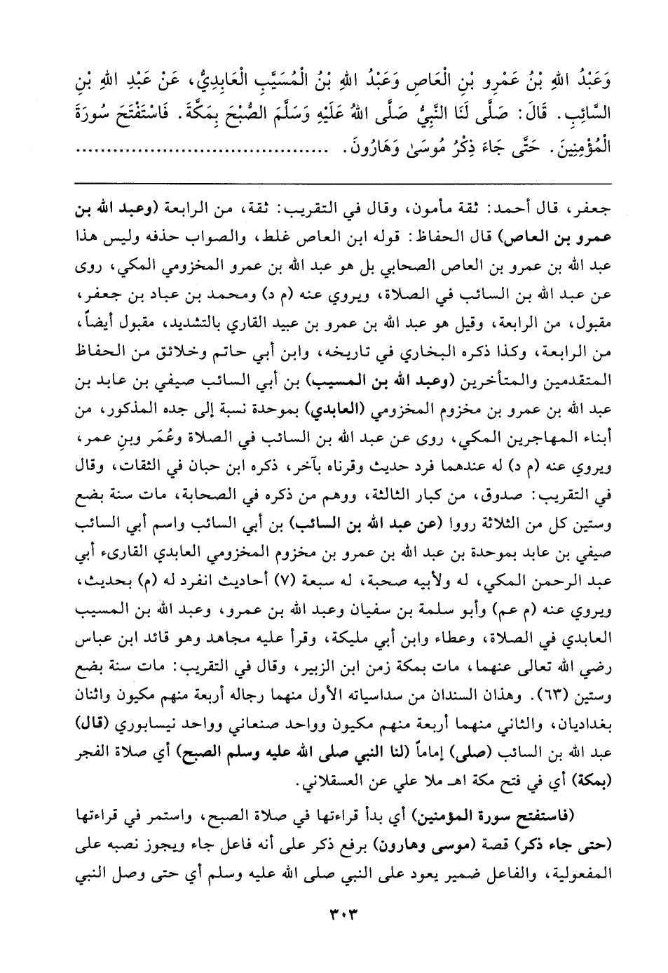 وَعَبْدُ اللهِ بْنُ عَمْرِو بْنِ الْعَاصِ وَعَبْدُ اللهِ بْنُ الْمُسَيَّبِ الْعَابِدِيُّ، عَنْ عَبْدِ اللهِ بْنِ السَّائِبِ. قَال: صَلَّى لَنَا النَّبِيُّ - صَلَّى اللهُ عَلَيهِ وَسَلَّمَ - الصُّبْحَ بِمَكَّةَ. فَاسْتَفْتَحَ سُورَةَ الْمُؤْمِنِينَ. حَتَّى جَاءَ ذِكْرُ مُوسَى وَهَارُونَ