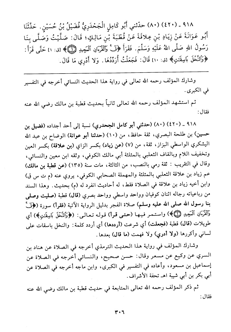 ٩١٨ - (٤٢٠) (٨٠) حدّثني أَبُو كَامِلٍ الْجَحْدَرِيُّ فُضَيلُ بْنُ حُسَينٍ. حَدَّثَنَا أَبُو عَوَانَةَ عَنْ زِيَادِ بْنِ عِلاقَةَ عَنْ قُطْبَةَ بْنِ مَالِكٍ؛ قَال: صَلَّيتُ وَصَلَّى بِنَا رَسُولُ اللهِ صَلَّى اللهُ عَلَيهِ وَسَلَّمَ. فَقَرَأَ {ق وَالْقُرْآنِ الْمَجِيدِ} [ق: ١] حَتَّى قَرَأَ: {وَالنَّخْلَ بَاسِقَاتٍ} [ق: ١٠] قَال: فَجَعَلْتُ أُرَدِّدُهَا. وَلا أَدْرِي مَا قَال