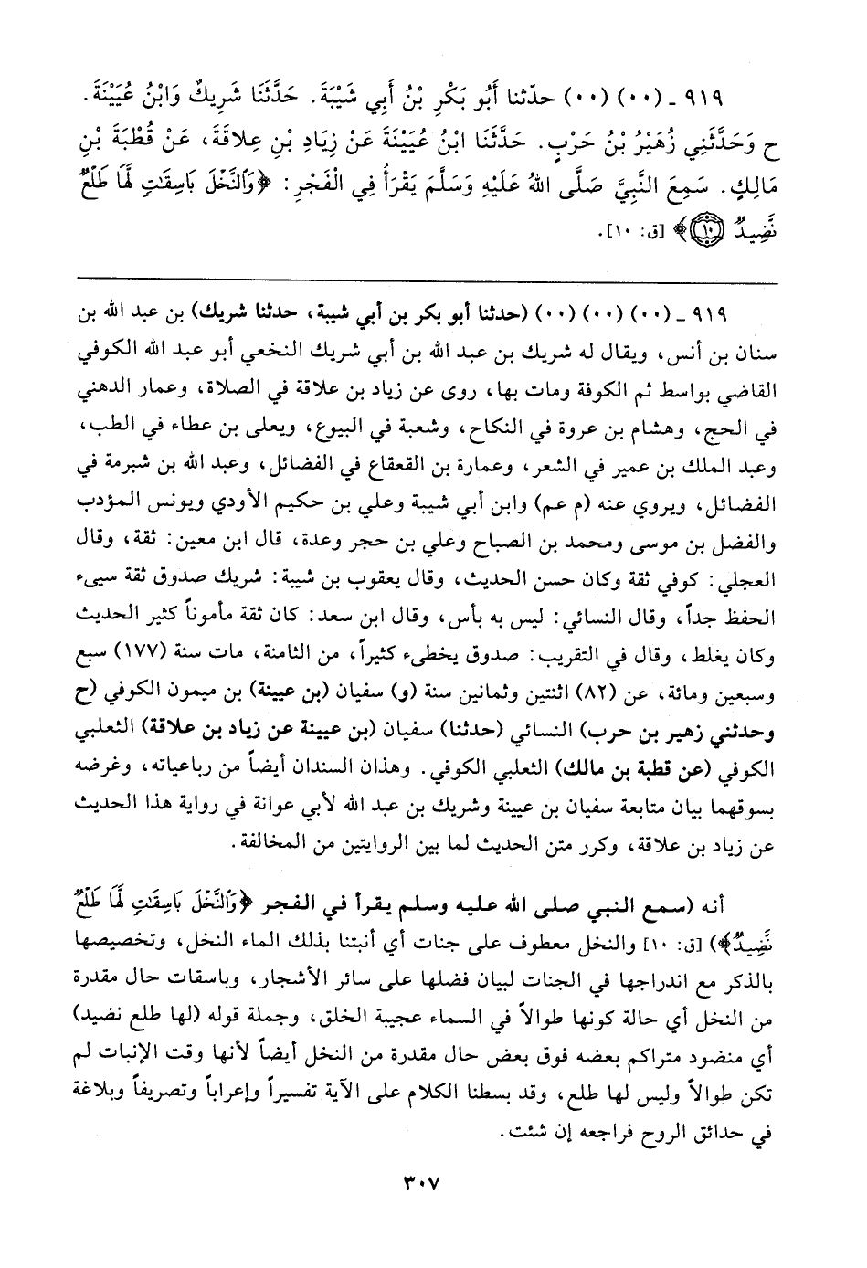 ٩١٩ - (. .) (. .) حدَّثنا أَبُو بَكْرِ بْنُ أَبِي شَيبَةَ. حَدَّثَنَا شَرِيكٌ وَابْنُ عُيَينَةَ. ح وَحَدَّثَنِي زُهَيرُ بْنُ حَرْبٍ. حَدَّثَنَا ابْنُ عُيَينَةَ عَنْ زِيَادِ بْنِ عِلاقَةَ، عَنْ قُطْبَةَ بْنِ مَالِكٍ. سَمِعَ النَّبِيَّ - صَلَّى اللهُ عَلَيهِ وَسَلَّمَ - يَقْرَأُ فِي الْفَجْرِ: {وَالنَّخْلَ بَاسِقَاتٍ لَهَا طَلْعٌ نَضِيدٌ} [ق: ١٠]