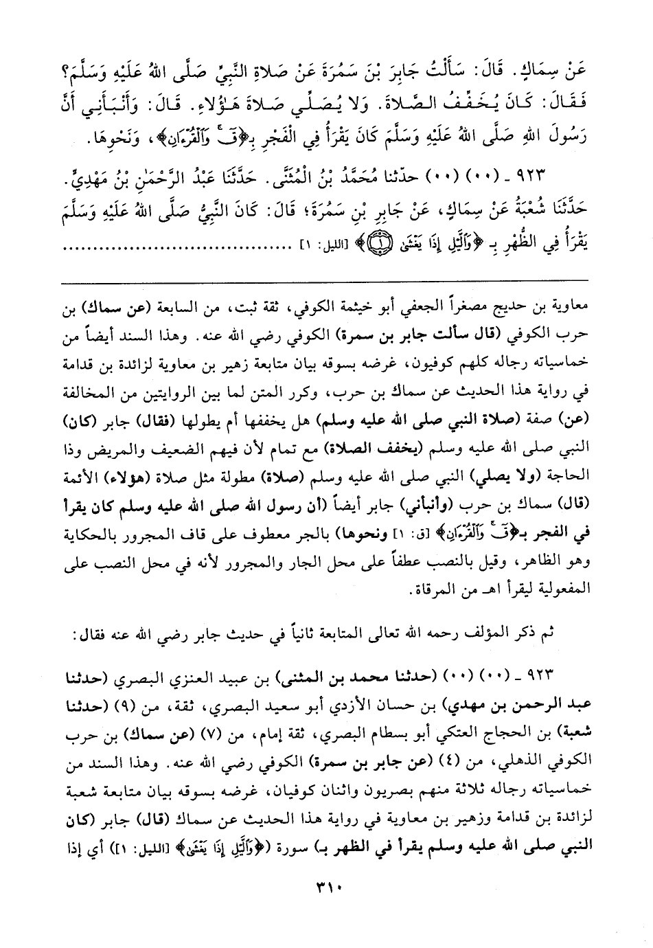 ٩٢٣ - (. .) (. .) (حدثنا محمَّد بن المثنى) بن عبيد العنزي البصري (حدثنا عبد الرحمن بن مهدي) بن حسان الأزدي أبو سعيد البصري، ثقة، من (٩) (حدثنا شعبة) بن الحجاج العتكي أبو بسطام البصري، ثقة إمام، من (٧) (عن سماك) بن حرب الكوفي الذهلي، من (٤) (عن جابر بن سمرة) الكوفي - رضي الله عنه -. وهذا السند من خماسياته رجاله ثلاثة منهم بصريون واثنان كوفيان، غرضه بسوقه بيان متابعة شعبة لزائدة بن قدامة وزهير بن معاوية في رواية هذا الحديث عن سماك (قال) جابر (كان النبي - صلى الله عليه وسلم - يقرأ في الظهر بـ) سورة ({وَاللَّيلِ إِذَا يَغْشَى} [الليل: ١]) أي إذا