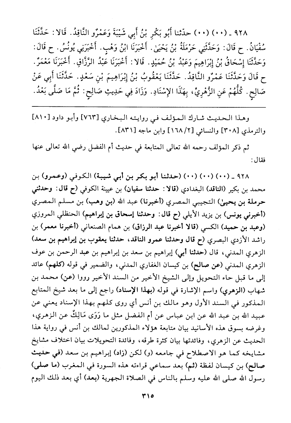 ٩٢٨ - (. .) (. .) (. .) (حدثنا أبو بكر بن أبي شيبة) الكوفي (وعمرو) بن محمَّد بن بكير (الناقد) البغدادي (قالا: حدثنا سفيان) بن عيينة الكوفي (ح قال: وحدثني حرملة بن يحيى) التجيبي المصري (أخبرنا) عبد الله (بن وهب) بن مسلم المصري (أخبرني يونس) بن يزيد الأيلي (ح قال: وحدثنا إسحاق بن إبراهيم) الحنظلي المروزي (وعبد بن حميد) الكسي (قالا أخبرنا عبد الرزاق) بن همام الصنعاني (أخبرنا معمر) بن راشد الأزدي البصري (ح قال وحدثنا عمرو الناقد، حدثنا يعقوب بن إبراهيم بن سعد) الزهري المدني، قال (حدثنا أبي) إبراهيم بن سعد بن إبراهيم بن عبد الرحمن بن عوف الزهري المدني (عن صالح) بن كيسان الغفاري المدني، والضمير في قوله (كلهم) عائد إلى ما قبل حاء التحويل وإلى الشيخ الأخير من السند الأخير رووا (عن) محمَّد بن شهاب (الزهري) واسم الإشارة في قوله (بهذا الإسناد) راجع إلى ما بعد شيخ المتابع المذكور في السند الأول وهو مالك بن أنس أي روى كلهم بهذا الإسناد يعني عن عبيد الله بن عبد الله عن ابن عباس عن أم الفضل مثل ما رَوَى مَالِكٌ عن الزهري، وغرضه بسوق هذه الأسانيد بيان متابعة هؤلاء المذكورين لمالك بن أنس في رواية هذا الحديث عن الزهري، وفائدتها بيان كثرة طرقه، وفائدة التحويلات بيان اختلاف مشايخ مشايخه كما هو الاصطلاح في جامعه (و) لكن (زاد) إبراهيم بن سعد (في حديث صالح) بن كيسان لفظة (ثمَّ) بعد سماعي قراءته هذه السورة في المغرب (ما صلى) رسول الله - صلى الله عليه وسلم - بالناس في الصلاة الجهرية (بعد) أي بعد ذلك اليوم