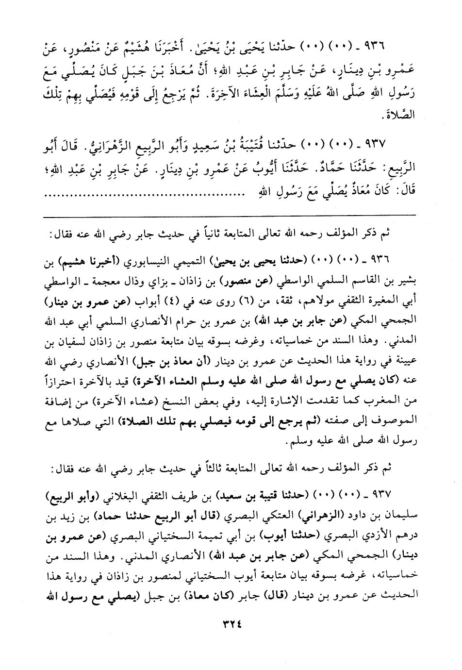 ٩٣٦ - (. .) (. .) حدَّثنا يَحْيَى بْنُ يَحْيَى. أَخْبَرَنَا هُشَيمٌ عَنْ مَنْصُورٍ، عَنْ عَمْرِو بْنِ دِينَارٍ، عَنْ جَابِرِ بْنِ عَبْدِ اللهِ؛ أَنَّ مُعَاذَ بْنَ جَبَلٍ كَانَ يُصَلِّي مَعَ رَسُولِ اللهِ - صَلَّى اللهُ عَلَيهِ وَسَلَّمَ - الْعِشَاءَ الآخِرَةَ. ثُمَّ يَرْجِعُ إِلَى قَوْمِهِ فَيُصَلِّي بِهِمْ تِلْكَ الصَّلاةَ.