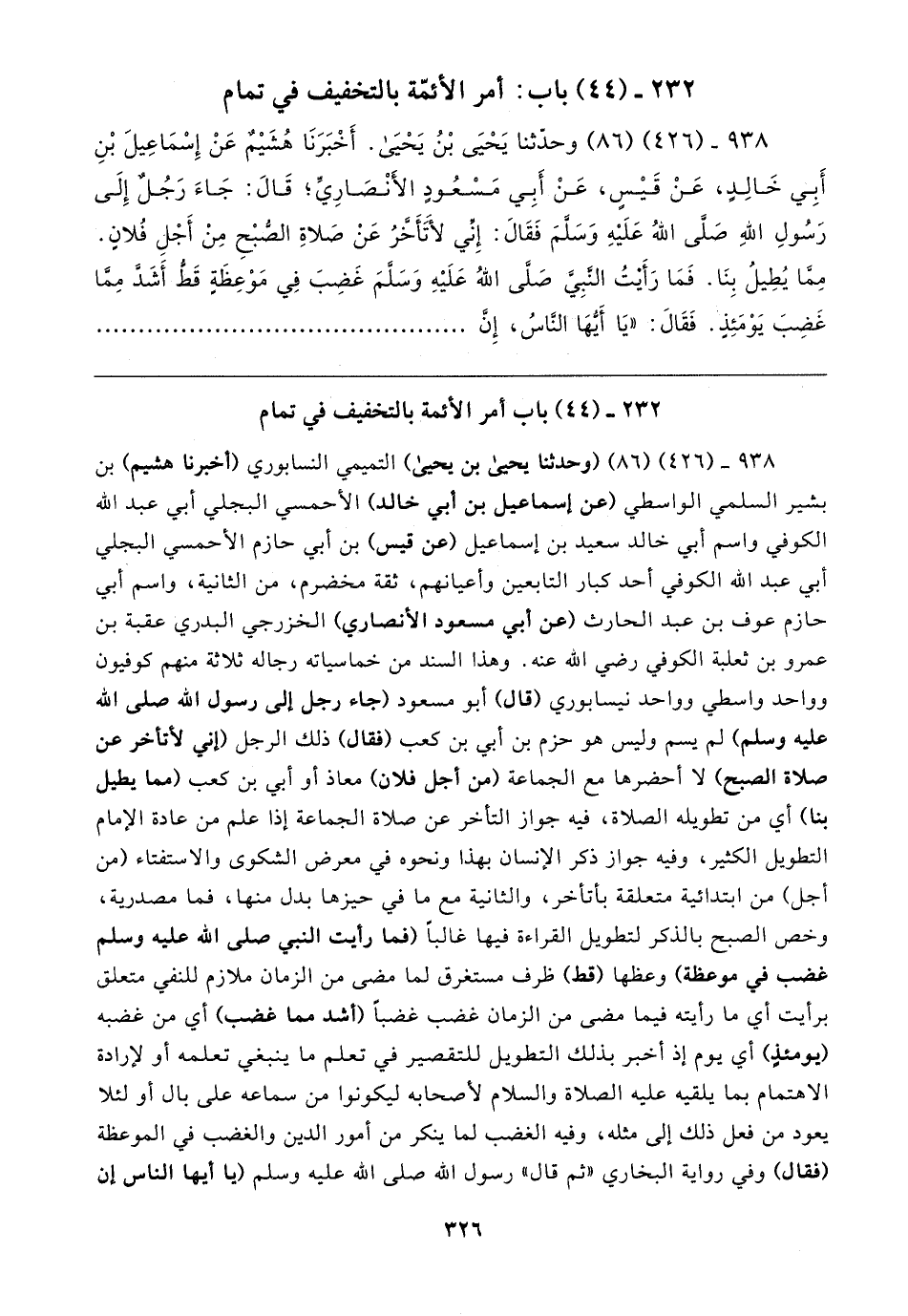 ٩٣٨ - (٤٢٦) (٨٦) (وحدثنا يحيى بن يحيى) التميمي النسابوري (أخبرنا هشيم) بن بشير السلمي الواسطي (عن إسماعيل بن أبي خالد) الأحمسي البجلي أبي عبد الله الكوفي واسم أبي خالد سعيد بن إسماعيل (عن قيس) بن أبي حازم الأحمسي البجلي أبي عبد الله الكوفي أحد كبار التابعين وأعيانهم، ثقة مخضرم، من الثانية، واسم أبي حازم عوف بن عبد الحارث (عن أبي مسعود الأنصاري) الخزرجي البدري عقبة بن عمرو بن ثعلبة الكوفي - رضي الله عنه -. وهذا السند من خماسياته رجاله ثلاثة منهم كوفيون وواحد واسطي وواحد نيسابوري (قال) أبو مسعود (جاء رجل إلى رسول الله - صلى الله عليه وسلم -) لم يسم وليس هو حزم بن أبي بن كعب (فقال) ذلك الرجل (إني لأتأخر عن صلاة الصبح) لا أحضرها مع الجماعة (من أجل فلان) معاذ أو أبي بن كعب (مما يطيل بنا) أي من تطويله الصلاة، فيه جواز التأخر عن صلاة الجماعة إذا علم من عادة الإمام التطويل الكثير، وفيه جواز ذكر الإنسان بهذا ونحوه في معرض الشكوى والاستفتاء (من أجل) من ابتدائية متعلقة بأتأخر، والثانية مع ما في حيزها بدل منها، فما مصدرية، وخص الصبح بالذكر لتطويل القراءة فيها غالبًا (فما رأيت النبي - صلى الله عليه وسلم - غضب في موعظة) وعظها (قط) ظرف مستغرق لما مضى من الزمان ملازم للنفي متعلق برأيت أي ما رأيته فيما مضى من الزمان غضب غضبًا (أشد مما غضب) أي من غضبه (يومئذٍ) أي يوم إذ أخبر بذلك التطويل للتقصير في تعلم ما ينبغي تعلمه أو لإرادة الاهتمام بما يلقيه عليه الصلاة والسلام لأصحابه ليكونوا من سماعه على بال أو لئلا يعود من فعل ذلك إلى مثله، وفيه الغضب لما ينكر من أمور الدين والغضب في الموعظة (فقال) وفي رواية البخاري "ثمَّ قال" رسول الله - صلى الله عليه وسلم - (يا أيها الناس إن