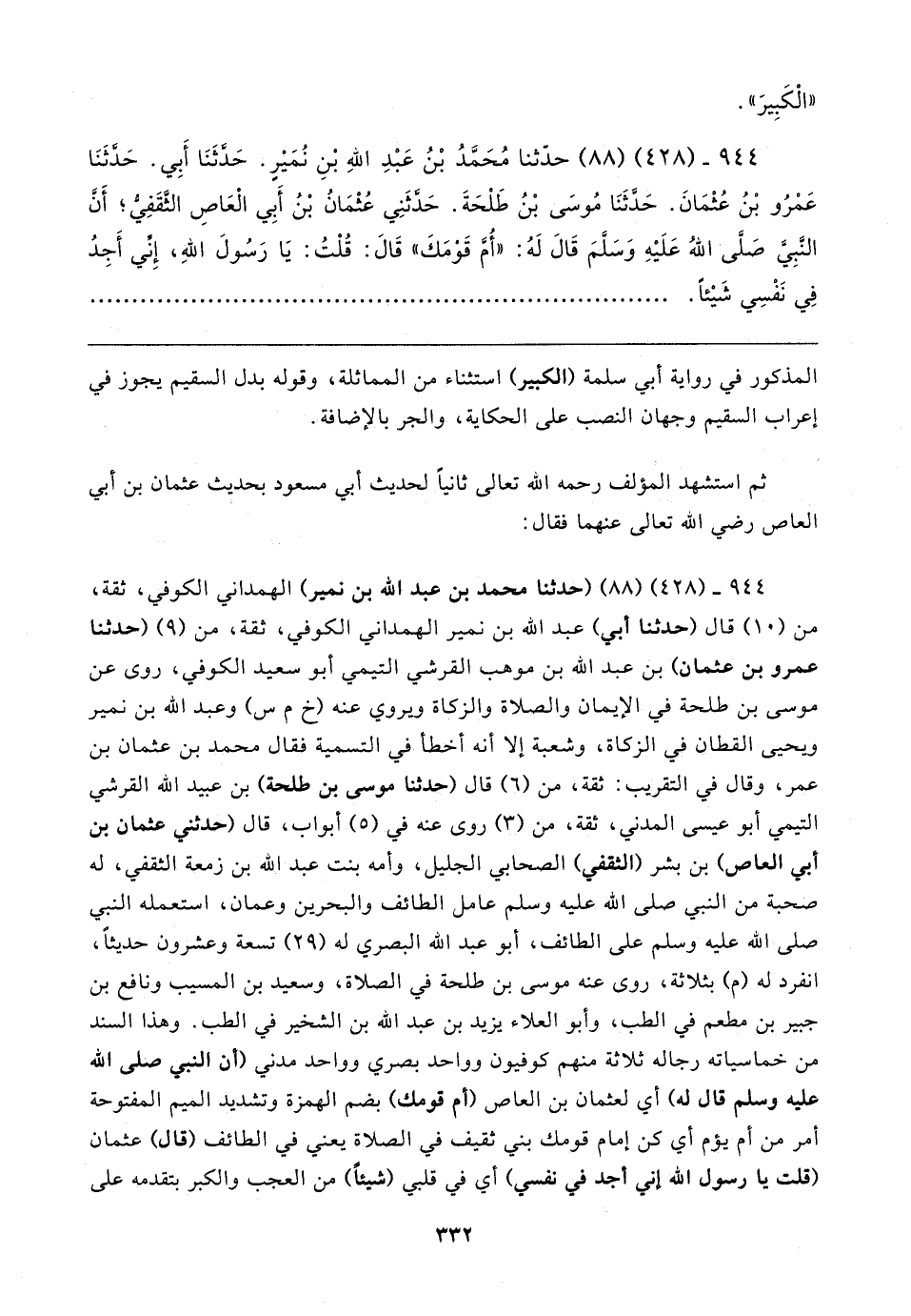 ٩٤٤ - (٤٢٨) (٨٨) (حدثنا محمَّد بن عبد الله بن نمير) الهمداني الكوفي، ثقة، من (١٠) قال (حدثنا أبي) عبد الله بن نمير الهمداني الكوفي، ثقة، من (٩) (حدثنا عمرو بن عثمان) بن عبد الله بن موهب القرشي التيمي أبو سعيد الكوفي، روى عن موسى بن طلحة في الإيمان والصلاة والزكاة ويروي عنه (خ م س) وعبد الله بن نمير ويحيى القطان في الزكاة، وشعبة إلا أنَّه أخطأ في التسمية فقال محمَّد بن عثمان بن عمر، وقال في التقريب: ثقة، من (٦) قال (حدثنا موسى بن طلحة) بن عبيد الله القرشي التيمي أبو عيسى المدني، ثقة، من (٣) روى عنه في (٥) أبواب، قال (حدثني عثمان بن أبي العاص) بن بشر (الثقفي) الصحابي الجليل، وأمه بنت عبد الله بن زمعة الثقفي، له صحبة من النبي - صلى الله عليه وسلم - عامل الطائف والبحرين وعمان، استعمله النبي - صلى الله عليه وسلم - على الطائف، أبو عبد الله البصري له (٢٩) تسعة وعشرون حديثًا، انفرد له (م) بثلاثة، روى عنه موسى بن طلحة في الصلاة، وسعيد بن المسيب ونافع بن جبير بن مطعم في الطب، وأبو العلاء يزيد بن عبد الله بن الشخير في الطب. وهذا السند من خماسياته رجاله ثلاثة منهم كوفيون وواحد بصري وواحد مدني (أن النبي - صلى الله عليه وسلم - قال له) أي لعثمان بن العاص (أم قومك) بضم الهمزة وتشديد الميم المفتوحة أمر من أم يؤم أي كن إمام قومك بني ثقيف في الصلاة يعني في الطائف (قال) عثمان (قلت يا رسول الله إني أجد في نفسي) أي في قلبي (شيئًا) من العجب والكبر بتقدمه على