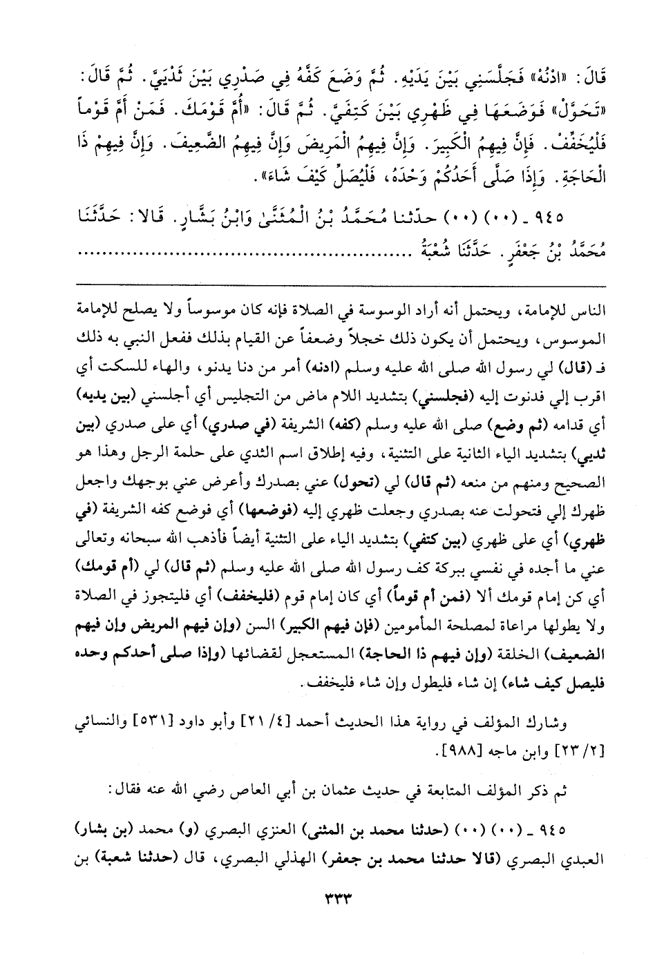 قَال: "ادْنُهْ" فَجَلَّسَنِي بَينَ يَدَيهِ. ثُمَّ وَضَعَ كَفَّهُ فِي صَدْرِي بَينَ ثَدْيَيَّ. ثُمَّ قَال: "تَحَوَّلْ" فَوَضَعَهَا فِي ظَهْرِي بَينَ كَتِفَيَّ. ثُمَّ قَال: "أُمَّ قَوْمَكَ. فَمَنْ أَمَّ قَوْمًا فَلْيُخَفِّفْ. فَإِنَّ فِيهِمُ الْكَبِيرَ. وَإِنَّ فِيهِمُ الْمَرِيضَ وَإِنَّ فِيهِمُ الضَّعِيفَ. وَإِنَّ فِيهِمْ ذَا الْحَاجَةِ. وَإِذَا صَلَّى أَحَدُكُمْ وَحْدَهُ، فَلْيُصَلِّ كَيفَ شَاءَ".