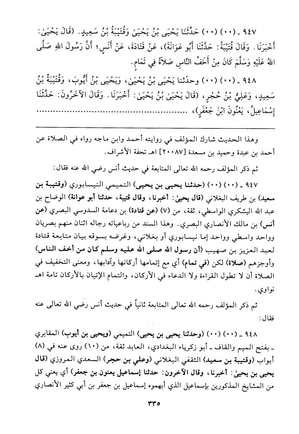 ٩٤٧ - (. .) (. .) حَدَّثَنَا يَحْيَى بْنُ يَحْيَى وَقُتَيبَةُ بْنُ سَعِيدٍ. (قَال يَحْيَى: أَخْبَرَنَا. وَقَال قُتَيبَةُ: حَدَّثَنَا أَبُو عَوَانَةَ)، عَنْ قَتَادَةَ، عَنْ أَنَسٍ؛ أَنَّ رَسُولَ اللهِ - صَلَّى اللهُ عَلَيهِ وَسَلَّمَ - كَانَ مِنْ أَخَفِّ النَّاسِ صَلاةً فِي تَمَامٍ.