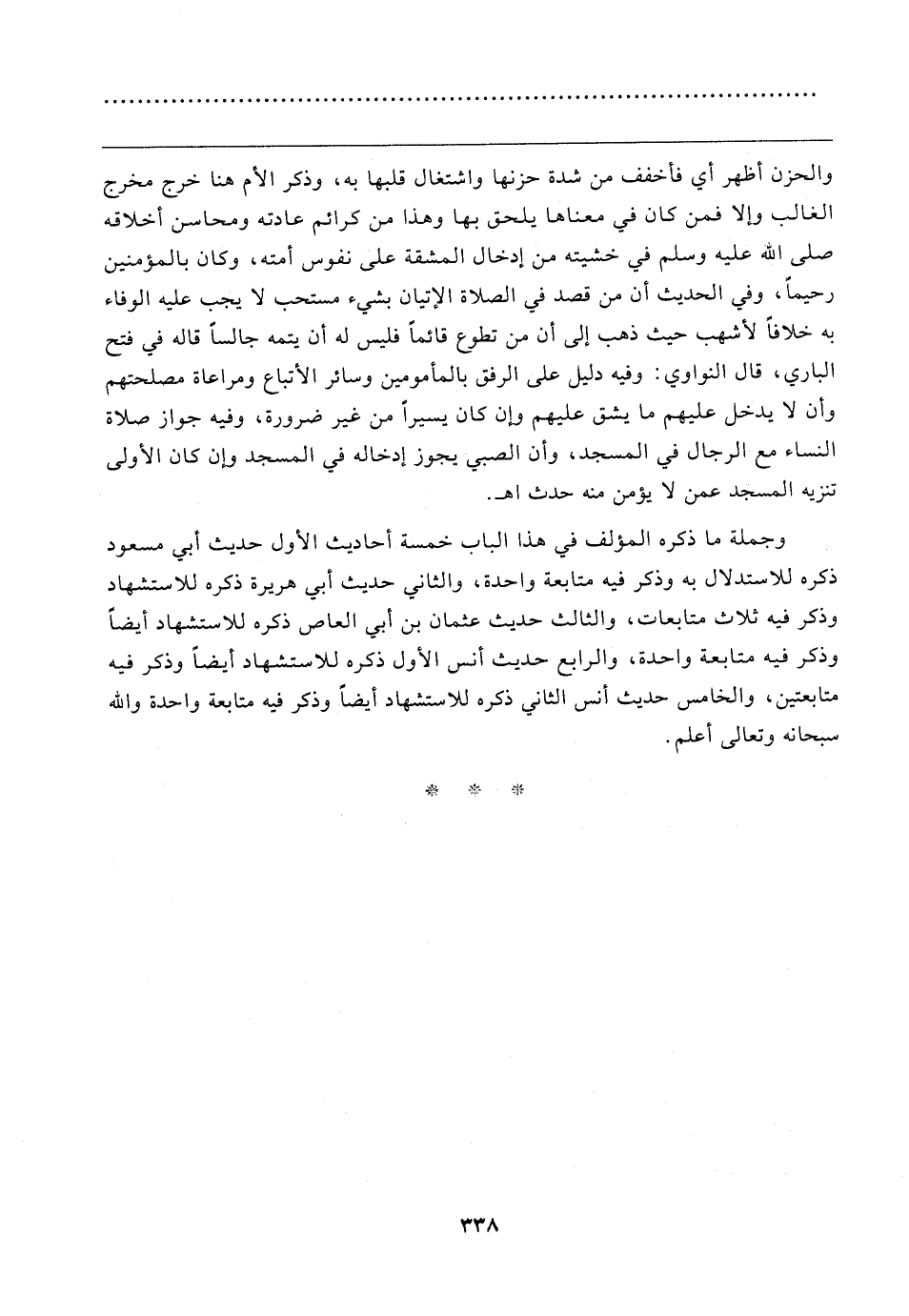 وجملة ما ذكره المؤلف في هذا الباب خمسة أحاديث الأول حديث أبي مسعود ذكره للاستدلال به وذكر فيه متابعة واحدة، والثاني حديث أبي هريرة ذكره للاستشهاد وذكر فيه ثلاث متابعات، والثالث حديث عثمان بن أبي العاص ذكره للاستشهاد أيضًا وذكر فيه متابعة واحدة، والرابع حديث أنس الأول ذكره للاستشهاد أيضًا وذكر فيه متابعتين، والخامس حديث أنس الثاني ذكره للاستشهاد أيضًا وذكر فيه متابعة واحدة والله سبحانه وتعالى أعلم.