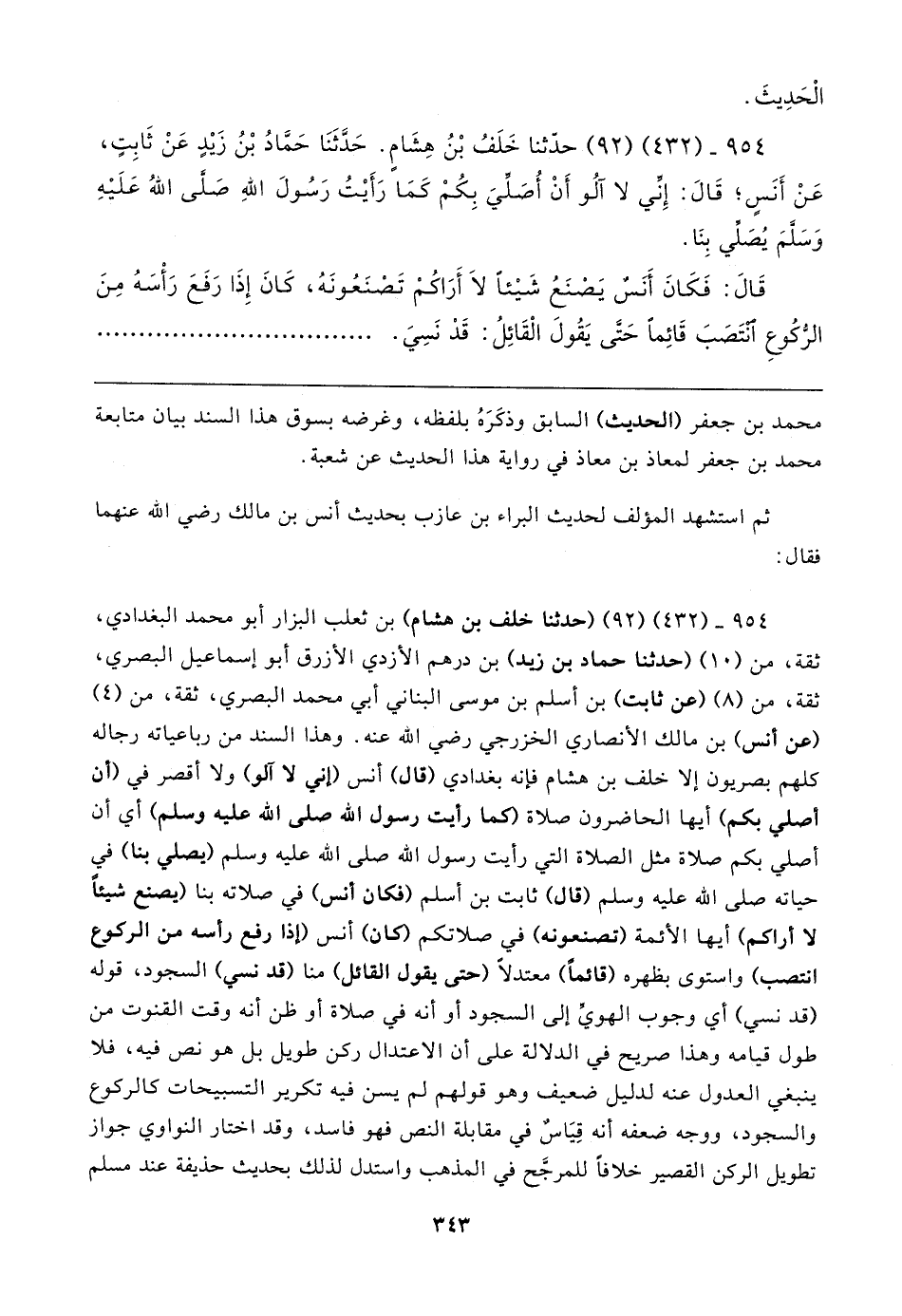 ٩٥٤ - (٤٣٢) (٩٢) (حدثنا خلف بن هشام) بن ثعلب البزار أبو محمد البغدادي، ثقة، من (١٠) (حدثنا حماد بن زيد) بن درهم الأزدي الأزرق أبو إسماعيل البصري، ثقة، من (٨) (عن ثابت) بن أسلم بن موسى البناني أبي محمد البصري، ثقة، من (٤) (عن أنس) بن مالك الأنصاري الخزرجي رضي الله عنه. وهذا السند من رباعياته رجاله كلهم بصريون إلا خلف بن هشام فإنه بغدادي (قال) أنس (إني لا آلو) ولا أقصر في (أن أصلي بكم) أيها الحاضرون صلاة (كما رأيت رسول الله صلى الله عليه وسلم) أي أن أصلي بكم صلاة مثل الصلاة التي رأيت رسول الله صلى الله عليه وسلم (يصلي بنا) في حياته صلى الله عليه وسلم (قال) ثابت بن أسلم (فكان أنس) في صلاته بنا (يصنع شيئًا لا أراكم) أيها الأئمة (تصنعونه) في صلاتكم (كان) أنس (إذا رفع رأسه من الركوع انتصب) واستوى بظهره (قائمًا) معتدلًا (حتى يقول القائل) منا (قد نسي) السجود، قوله (قد نسي) أي وجوب الهويِّ إلى السجود أو أنه في صلاة أو ظن أنه وقت القنوت من طول قيامه وهذا صريح في الدلالة على أن الاعتدال ركن طويل بل هو نص فيه، فلا ينبغي العدول عنه لدليل ضعيف وهو قولهم لم يسن فيه تكرير التسبيحات كالركوع والسجود، ووجه ضعفه أنه قِيَاسٌ في مقابلة النص فهو فاسد، وقد اختار النواوي جواز تطويل الركن القصير خلافًا للمرجَّح في المذهب واستدل لذلك بحديث حذيفة عند مسلم