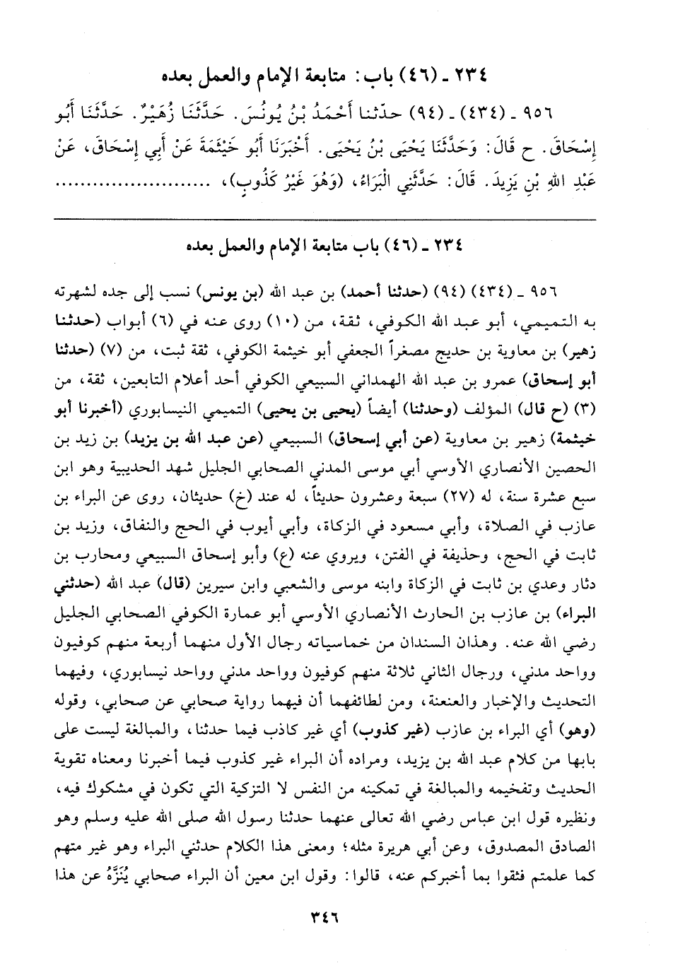 ٩٥٦ - (٤٣٤) (٩٤) (حدثنا أحمد) بن عبد الله (بن يونس) نسب إلى جده لشهرته به التميمي، أبو عبد الله الكوفي، ثقة، من (١٠) روى عنه في (٦) أبواب (حدثنا زهير) بن معاوية بن حديج مصغرًا الجعفي أبو خيثمة الكوفي، ثقة ثبت، من (٧) (حدثنا أبو إسحاق) عمرو بن عبد الله الهمداني السبيعي الكوفي أحد أعلام التابعين، ثقة، من (٣) (ح قال) المؤلف (وحدثنا) أيضًا (يحيى بن يحيى) التميمي النيسابوري (أخبرنا أبو خيثمة) زهير بن معاوية (عن أبي إسحاق) السبيعي (عن عبد الله بن يزيد) بن زيد بن الحصين الأنصاري الأوسي أبي موسى المدني الصحابي الجليل شهد الحديبية وهو ابن سبع عشرة سنة، له (٢٧) سبعة وعشرون حديثًا، له عند (خ) حديثان، روى عن البراء بن عازب في الصلاة، وأبي مسعود في الزكاة، وأبي أيوب في الحج والنفاق، وزيد بن ثابت في الحج، وحذيفة في الفتن، ويروي عنه (ع) وأبو إسحاق السبيعي ومحارب بن دثار وعدي بن ثابت في الزكاة وابنه موسى والشعبي وابن سيرين (قال) عبد الله (حدثني البراء) بن عازب بن الحارث الأنصاري الأوسي أبو عمارة الكوفي الصحابي الجليل رضي الله عنه. وهذان السندان من خماسياته رجال الأول منهما أربعة منهم كوفيون وواحد مدني، ورجال الثاني ثلاثة منهم كوفيون وواحد مدني وواحد نيسابوري، وفيهما التحديث والإخبار والعنعنة، ومن لطائفهما أن فيهما رواية صحابي عن صحابي، وقوله (وهو) أي البراء بن عازب (غير كذوب) أي غير كاذب فيما حدثنا، والمبالغة ليست على بابها من كلام عبد الله بن يزيد، ومراده أن البراء غير كذوب فيما أخبرنا ومعناه تقوية الحديث وتفخيمه والمبالغة في تمكينه من النفس لا التزكية التي تكون في مشكوك فيه، ونظيره قول ابن عباس رضي الله تعالى عنهما حدثنا رسول الله صلى الله عليه وسلم وهو الصادق المصدوق، وعن أبي هريرة مثله؛ ومعنى هذا الكلام حدثني البراء وهو غير متهم كما علمتم فثقوا بما أخبركم عنه، قالوا: وقول ابن معين أن البراء صحابي يُنَزَّهُ عن هذا