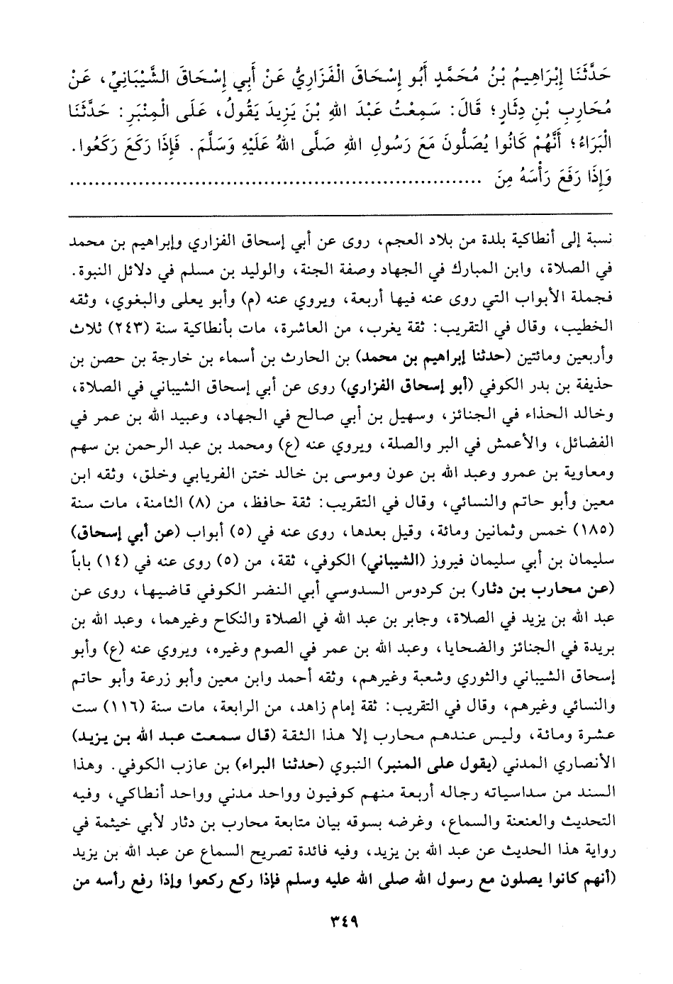 حَدَّثَنَا إِبْرَاهِيمُ بْنُ مُحَمَّدٍ أَبُو إِسْحَاقَ الْفَزَارِيُّ عَنْ أَبِي إِسْحَاقَ الشَّيبَانِيِّ، عَنْ مُحَارِبِ بْنِ دِثَارٍ؛ قَال: سَمِعْتُ عَبْدَ اللهِ بْنَ يَزِيدَ يَقُولُ، عَلَى الْمِنْبَرِ: حَدَّثَنَا الْبَرَاءُ؛ أَنهُمْ كَانُوا يُصَلُّونَ مَعَ رَسُولِ اللهِ صَلَّى اللهُ عَلَيهِ وَسَلَّمَ. فَإِذَا رَكَعَ رَكَعُوا. وَإِذَا رَفَعَ رَأسَهُ مِنَ