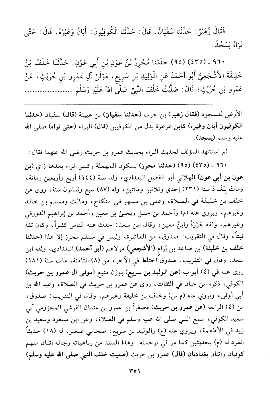 ٩٦٠ - (٤٣٥) (٩٥) حدَّثنا مُحْرِزُ بْنُ عَوْنِ بْنِ أَبِي عَوْنٍ. حَدَّثَنَا خَلَفُ بْنُ خَلِيفَةَ الأَشْجَعِيُّ أَبُو أَحْمَدَ عَنِ الْوَلِيدِ بْنِ سَرِيعٍ، مَوْلَى آلِ عَمْرِو بْنِ حُرَيثٍ، عَنْ عَمْرِو بْنِ حُرَيثٍ؛ قَال: صَلَّيتُ خَلْفَ النَّبِيِّ صَلَّى اللهُ عَلَيهِ وَسَلَّمَ