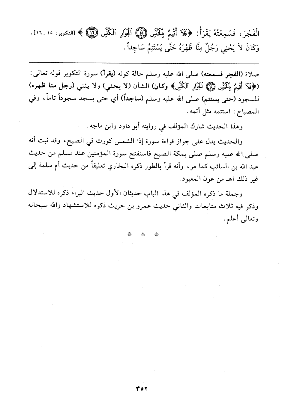 الْفَجْرَ، فَسَمِعْتُهُ يَقْرَأُ: {فَلَا أُقْسِمُ بِالْخُنَّسِ (١٥) الْجَوَارِ الْكُنَّسِ (١٦)} [التكوير: ١٥، ١٦]. وَكَانَ لَا يَحْنِي رَجُلٌ مِنَا ظَهْرَهُ حَتَّى يَسْتَتِمَّ سَاجِدًا