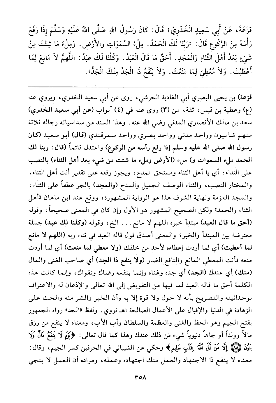 قَزَعَةَ، عَنْ أَبِي سَعِيدٍ الْخُدْرِيِّ؛ قَال: كَانَ رَسُولُ اللهِ صَلَّى اللهُ عَلَيهِ وَسَلَّمَ إِذَا رَفَعَ رَأْسَهُ مِنَ الرُّكُوعِ قَال: "رَبَّنَا لَكَ الْحَمْدُ. مِلْءُ السَّمَوَاتِ والأرضِ. وَمِلْءُ مَا شِئْتَ مِنْ شَيءٍ بَعْدُ أَهْلَ الثَّنَاءِ وَالْمَجْدِ. أَحَقُّ مَا قَال الْعَبْدُ. وَكُلُّنَا لَكَ عَبْدْ: اللَّهمَّ لَا مَانِعَ لِمَا أَعْطَيتَ. وَلَا مُعْطِيَ لِمَا مَنَعْتَ. وَلَا يَنْفَعُ ذَا الْجَدِّ مِنْكَ الْجَدُّ"