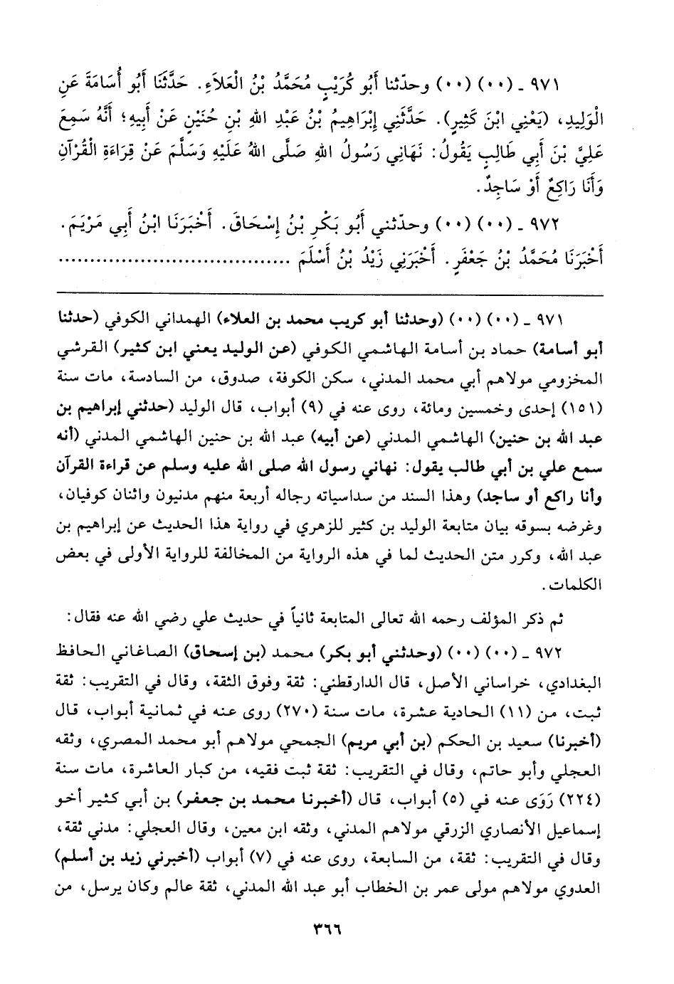 ٩٧١ - (٠٠) (٠٠) (وحدثنا أبو كريب محمد بن العلاء) الهمداني الكوفي (حدثنا أبو أسامة) حماد بن أسامة الهاشمي الكوفي (عن الوليد يعني ابن كثير) القرشي المخزومي مولاهم أبي محمد المدني، سكن الكوفة، صدوق، من السادسة، مات سنة (١٥١) إحدى وخمسين ومائة، روى عنه في (٩) أبواب، قال الوليد (حدثني إبراهيم بن عبد الله بن حنين) الهاشمي المدني (عن أبيه) عبد الله بن حنين الهاشمي المدني (أنه سمع علي بن أبي طالب يقول: نهاني رسول الله صلى الله عليه وسلم عن قراءة القرآن وأنا راكع أو ساجد) وهذا السند من سداسياته رجاله أربعة منهم مدنيون واثنان كوفيان، وغرضه بسوقه بيان متابعة الوليد بن كثير للزهري في رواية هذا الحديث عن إبراهيم بن عبد الله، وكرر متن الحديث لما في هذه الرواية من المخالفة للرواية الأولى في بعض الكلمات.